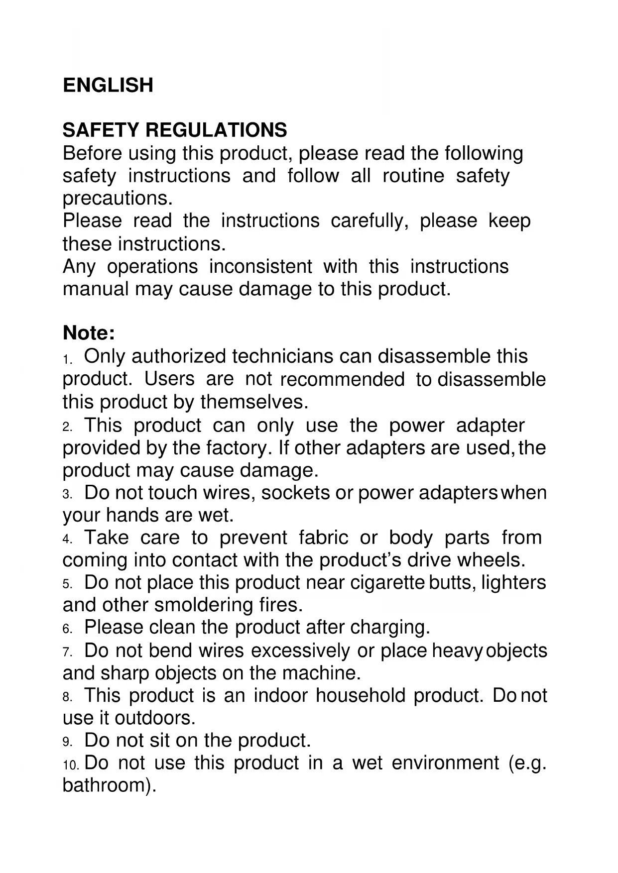 Do not use this product in a wet environment (e.g. bathroom).11. Before using this product, please remove all vulnerable items (e.g. glasses, lamps, etc.) from the ground as well as items (e.g. wires, paper sheets, curtains) that may get stuck in the side brushes and air suction passages.