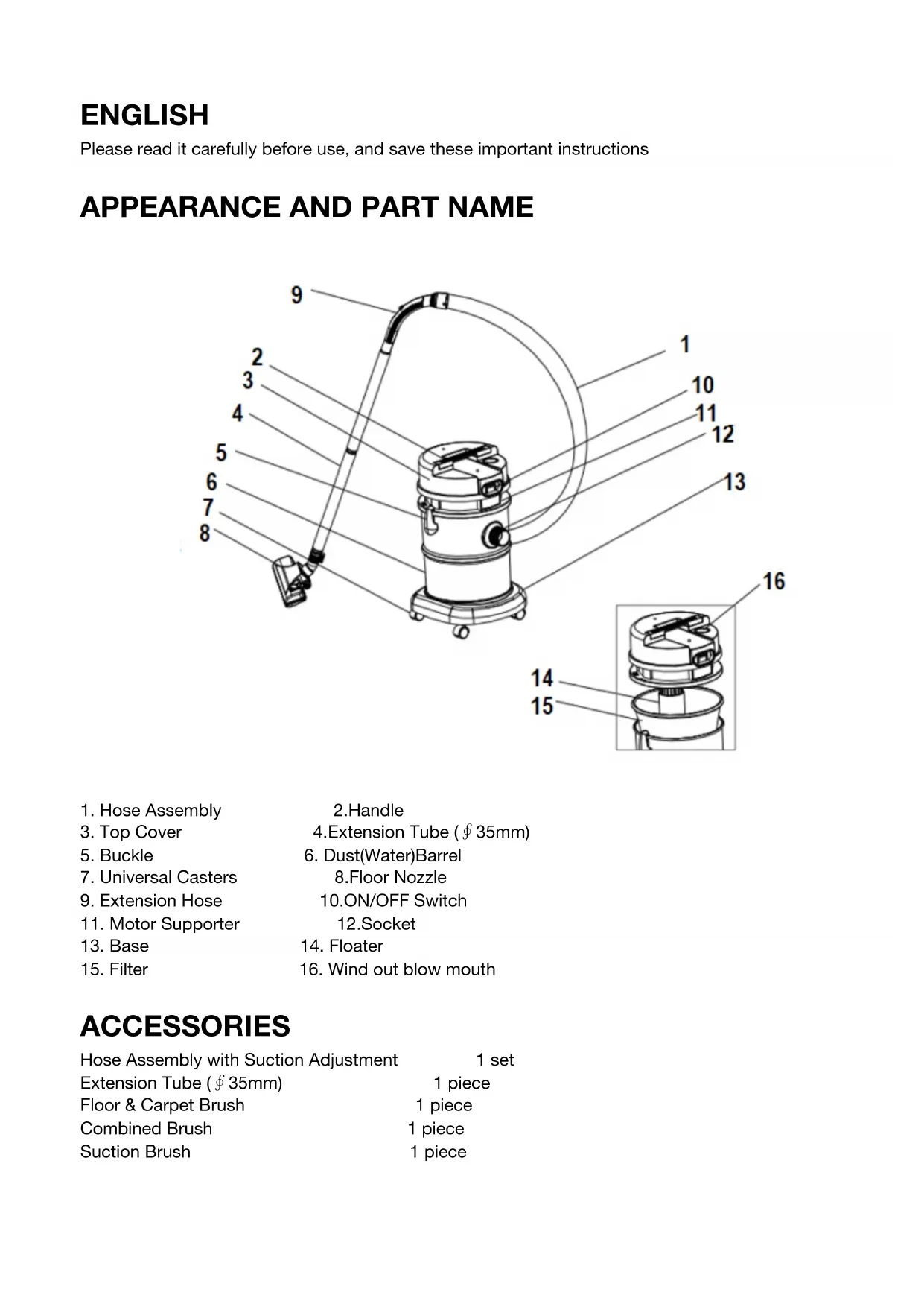 ACCESSORIES Hose Assembly with Suction Adjustment 1 set Extension Tube (∮35mm) 1 piece Floor & Carpet Brush 1 piece Combined Brush 1 piece Suction Brush 1 pieceFEATURES