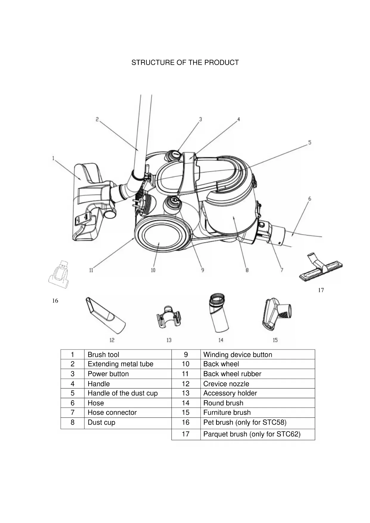 /58/62ENGLISH Product Power (W) Accessories STC56 700 W Crevice nozzle, round and furniture brush STC58 850 W STC56 + pet brush STC62 850 W STC56 + parquet brushSTRUCTURE OF THE PRODUCT