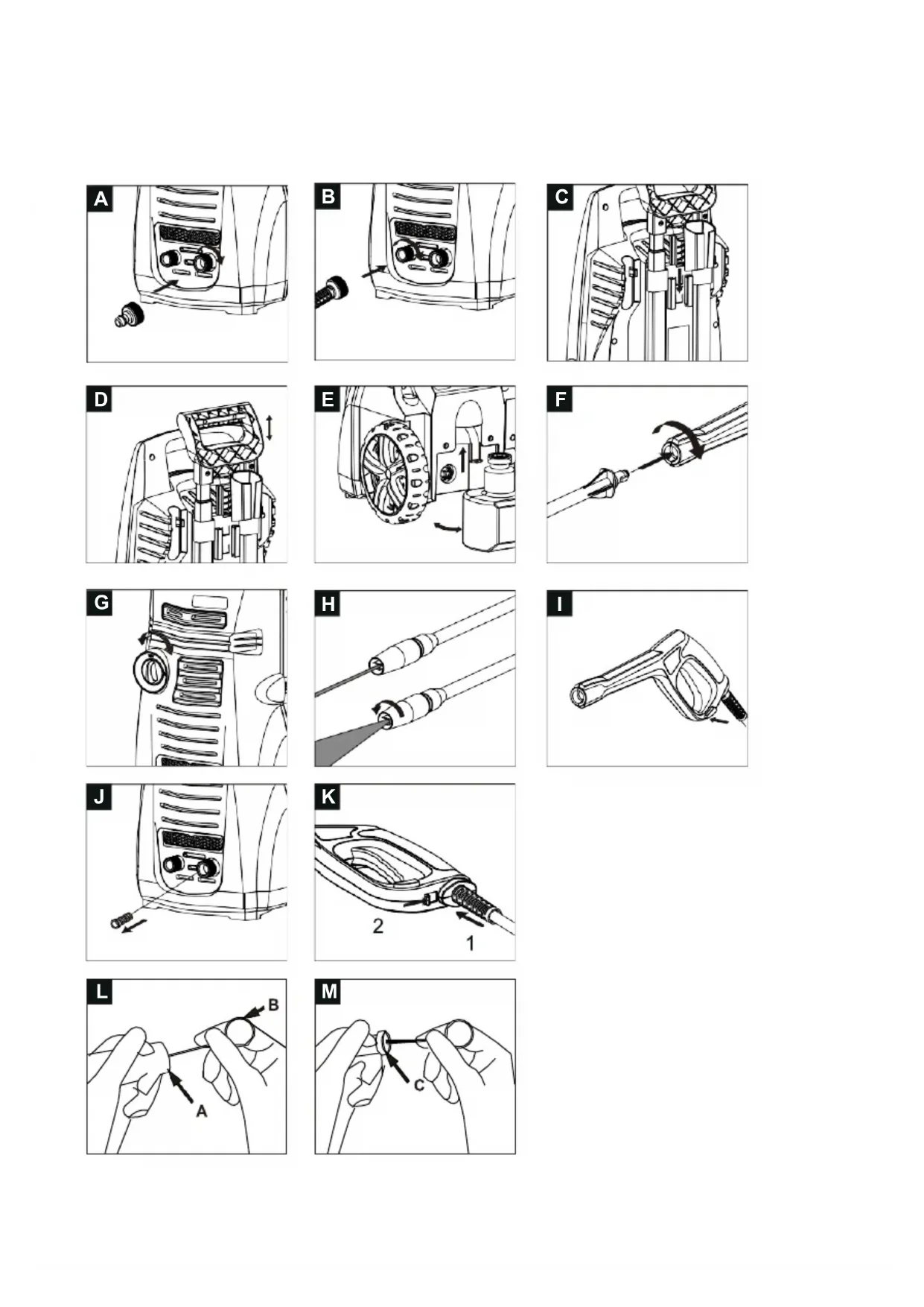 Never leave the appliance unattended when it is in operation.Operation Special accessories expand the possibilities of using your appliance. Please contact the dealer for further information. Illustrate accessories before start-up. 1.Install coupling for water connection (pic A). Screw the coupling to the water connection on the appliance. 2.Install high pressure hose (pic B. pic K). Insert the high pressure hose tightly in to coupling on the appliance, it will lock in audibly. Note: make sure the connection nipple is aligned correctly. Check the secure connection by pulling on the high pressure hose.