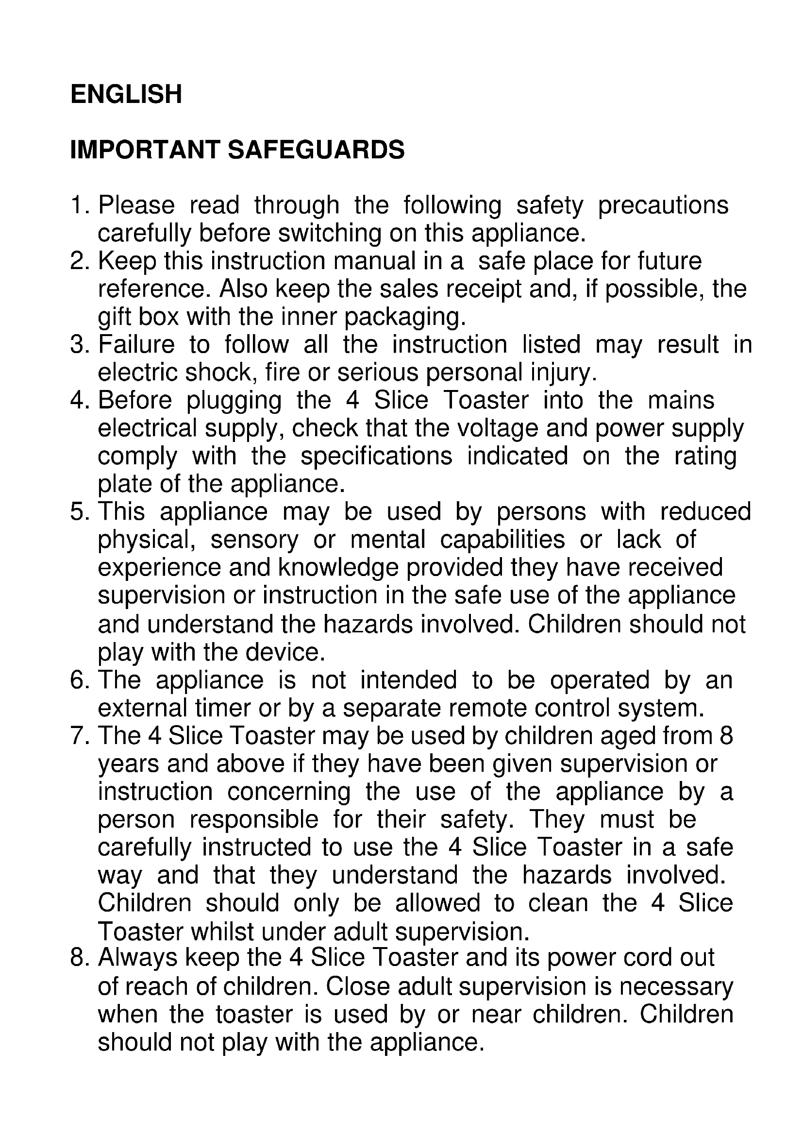 The 4 Slice Toaster may be used by children aged from 8 years and above if they have been given supervision or instruction concerning the use of the appliance by a person responsible for their safety. They must be carefully instructed to use the 4 Slice Toaster in a safe way and that they understand the hazards involved. Children should only be allowed to clean the 4 Slice Toaster whilst under adult supervision.
