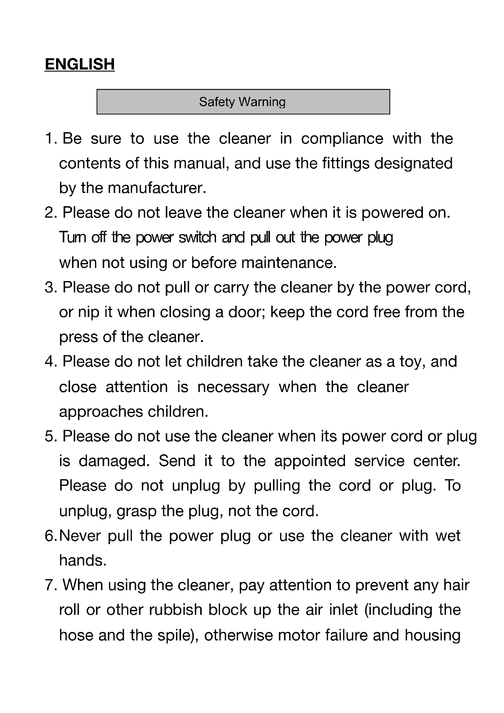 roll or other rubbish block up the air inlet (including the hose and the spile), otherwise motor failure and housing Safety Warningdistortion may be caused. If the matters absorbed in forms a blockage, stop the cleaner by pulling out the power plug immediately to clean the blockage.