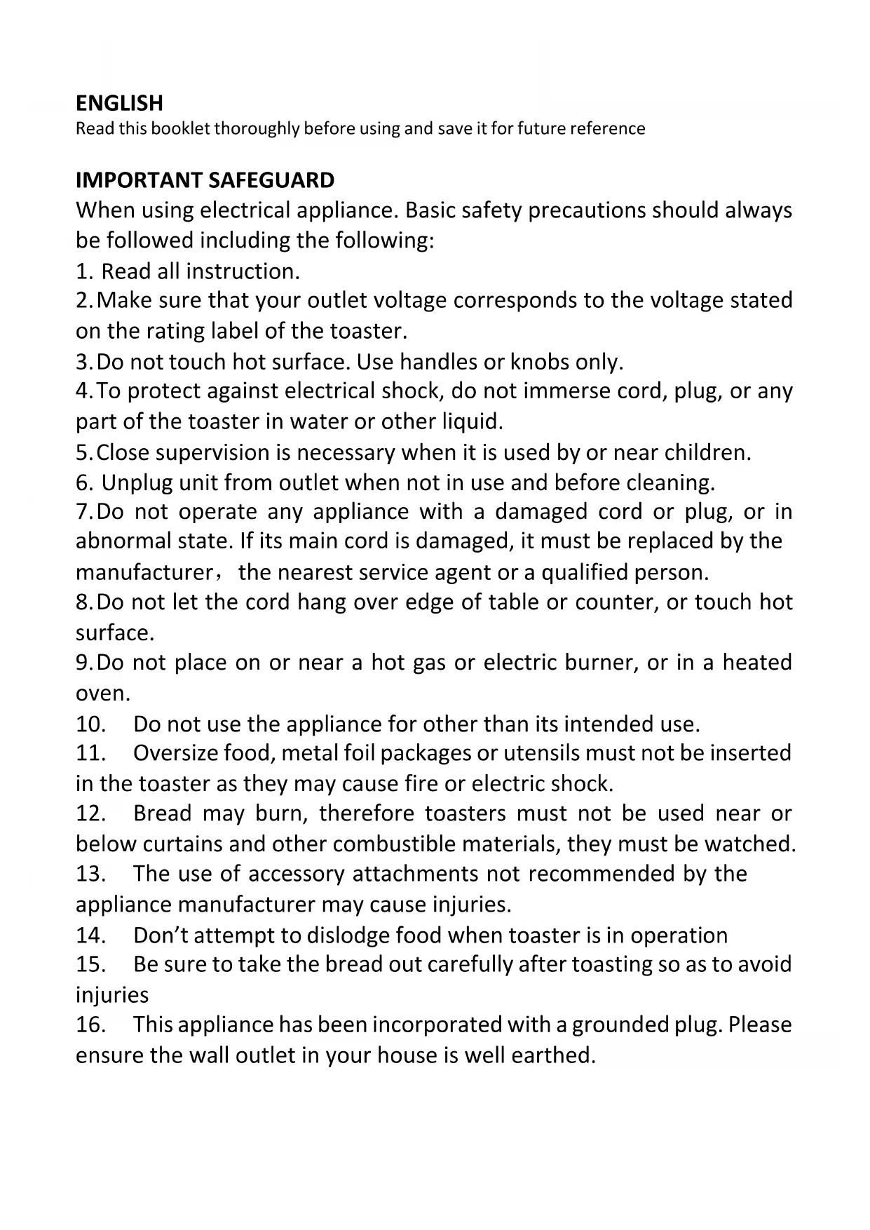 Toaster Grille Pain Tostadora Tostapane tos8ENGLISH Read this booklet thoroughly before using and save it for future reference IMPORTANT SAFEGUARD When using electrical appliance. Basic safety precautions should always be followed including the following: