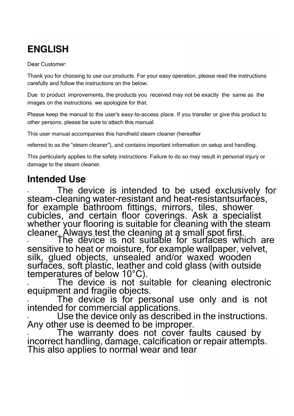 The device is intended to be used exclusively for steam-cleaning water-resistant and heat-resistant surfaces, for example bathroom fittings, mirrors, tiles, shower cubicles, and certain floor coverings. Ask a specialist whether your flooring is suitable for cleaning with the steam cleaner. Always test the cleaning at a small spot first.