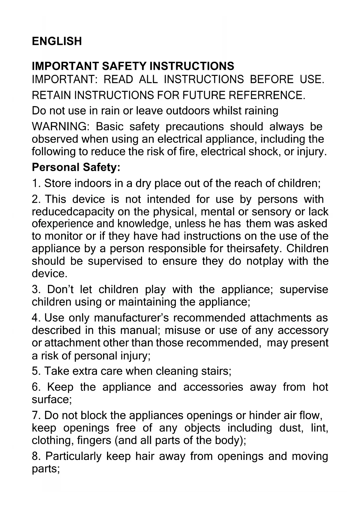 Particularly keep hair away from openings and moving parts;9. This appliance may be used by children of at least 8 years of age, as long as they are supervised and have been given instructions about using the appliance safely and are fully aware of the dangers involved.