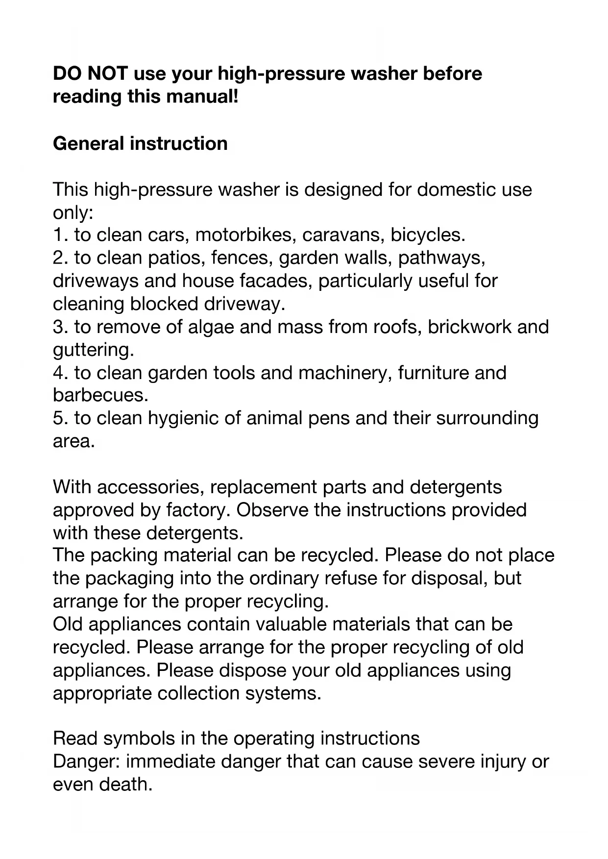 reading this manual! General instruction This high-pressure washer is designed for domestic use only: