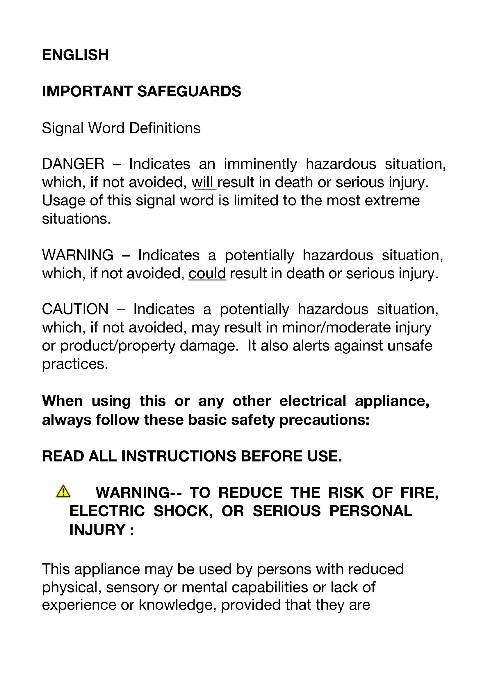 INJURY : This appliance may be used by persons with reduced physical, sensory or mental capabilities or lack of experience or knowledge, provided that they aresupervised or instructed in the safe use of the appliance and that they fully understand the potential hazards. Cleaning and user maintenance shall not be made by children unless they are older than 8 and supervised. Keep the appliance and its cord out of reach of children less than 8 years cleaning and user maintenance shall not be made by children without supervision Caution, hot surface, the surfaces are liable to get hot during use. Always use the product on a flat, stable, heat-resistant surface. The temperature of the accessible surfaces may be very high when the appliance is in use. Make sure not to touch these hot parts of the appliance. Use the product in a well-ventilated area. Keep at least 4- 6 inches of space on all sides of the product to allow adequate air circulation. Do not place the product on or near a gas or electric burner, or inside or on top of a heated oven or other heat source. Do not allow the product to touch curtains, wall coverings, clothing, dishtowels, or other flammable materials during its use. Do not touch hot surfaces of the product. Do not move the product while it is plugged in. Allow the product to thoroughly cool before handling it. Do not use attachments not recommended for use with this product or sold by the product manufacturer. Do not use the product near water or other liquids.Do not place or drop the product into water or other liquids. If the product falls into water, immediately unplug it from the electrical outlet. Do not touch or reach into the water. Do not leave the product unattended while it is in use. The appliance is not intended to be operated by means of an external timer or separate remote-control system. Appliances not intended to be partially immersed in water for cleaning Do not put any stress on the Power Cord where it connects to the product as the Power Cord could fray and break. Do not plug or unplug the product into/from an electrical outlet with a wet hand. Keep the product and its Power Cord away from heated surfaces. Never operate this product if it has a damaged Power Cord or Plug, is not working properly, has been dropped, damaged, or exposed to water or other liquids. If the supply cord is damaged, it must be replaced by the manufacturer or its service agent or a similarly qualified person in order to avoid a hazard This appliance is intended for use in domestic and similar applications such as : - kitchen areas in shops, offices and other working environments - farmhouses - in hotels, motels and other residential environments - guest rooms. This appliance may be used by children of at least 8 years of age, as long as they are supervised and have been given instructions about using the appliance safely and are fully aware of the dangers involved.CAUTION-- TO REDUCE THE RISK OF PERSONAL INJURY OR PRODUCT/PROPERTY DAMAGE: