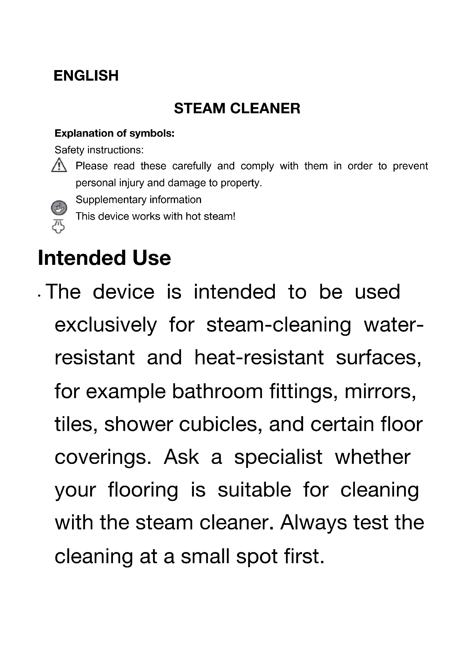 - The device is intended to be used exclusively for steam-cleaning water- resistant and heat-resistant surfaces, for example bathroom fittings, mirrors, tiles, shower cubicles, and certain floor coverings. Ask a specialist whether your flooring is suitable for cleaning with the steam cleaner. Always test the cleaning at a small spot first.• The device is not suitable for surfaces which are sensitive to heat or moisture, for example wallpaper, velvet, silk, glued objects, unsealed and/or waxed wooden surfaces, soft plastic, leather and cold glass (with outside temperatures of below 10°C).