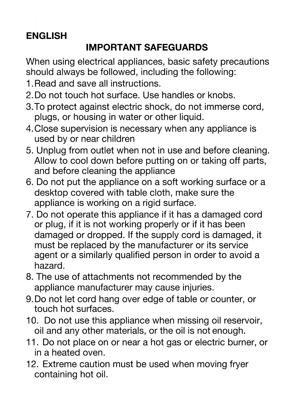 placing oil in the oil reservoir first.36. The oil in the oil reservoir will be still hot after it is switched off. Never attempt to move your fryer until it is completely cool down, lift the oil reservoir use the handles.