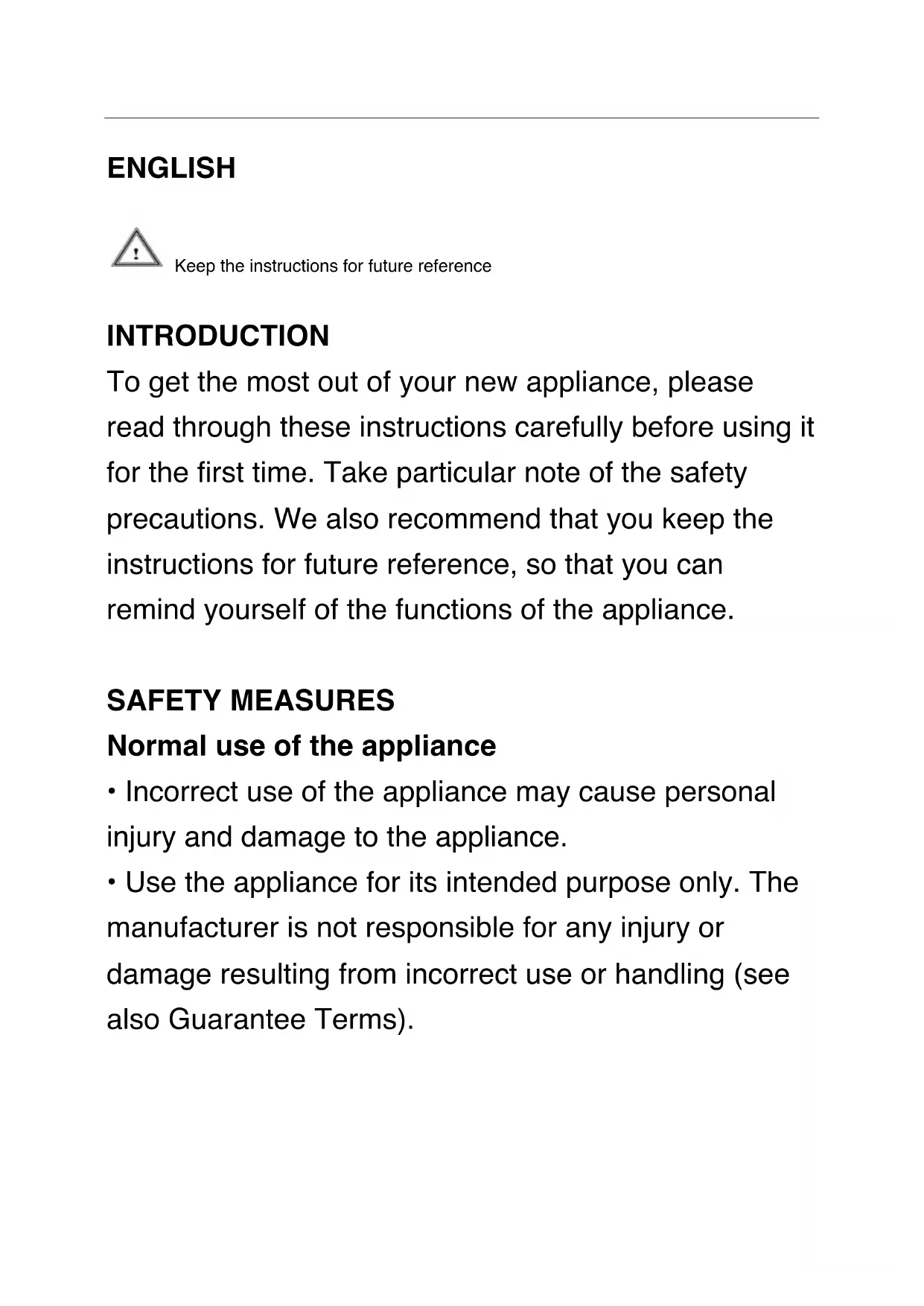 - Use the appliance for its intended purpose only. The manufacturer is not responsible for any injury or damage resulting from incorrect use or handling (see also Guarantee Terms).• Do not use any accessories other than those recommended by the manufacturer.