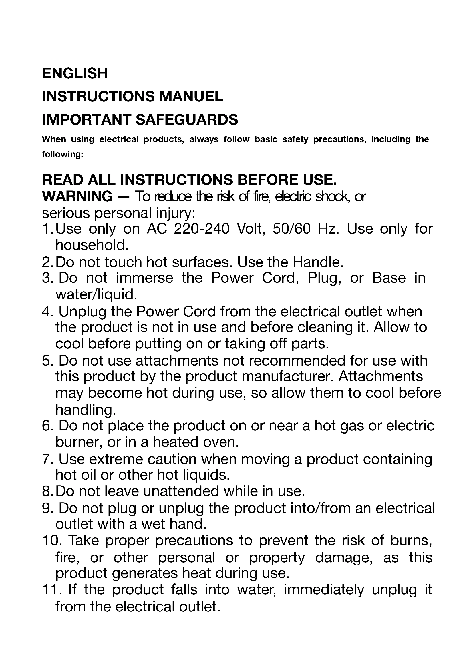 11. If the product falls into water, immediately unplug it
