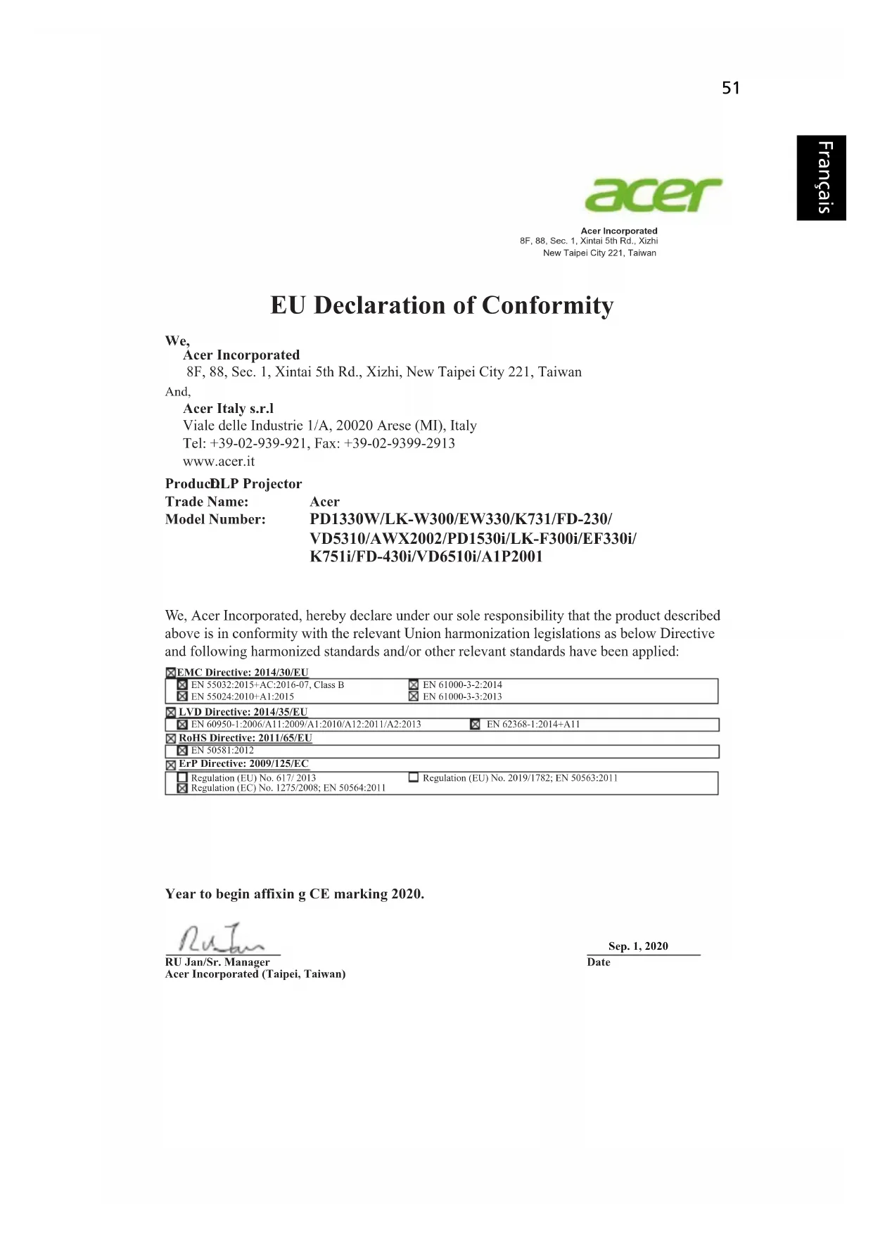 RU Jan/Sr. Manager Acer Incorporated (Taipei, Taiwan) Date Sep. 1, 2020 Year to begin affixin g CE marking 2020. PD1330W/LK-W300/EW330/K731/FD-230/ VD5310/AWX2002/PD1530i/LK-F300i/EF330i/ K751i/FD-430i/VD6510i/A1P2001 EMC Directive: 2014/30/EU EN 55032:2015+AC:2016-07, Class B EN 55024:2010+A1:2015 EN 61000-3-2:2014 EN 61000-3-3:2013 LVD Directive: 2014/35/EU EN 60950-1:2006/A11:2009/A1:2010/A12:2011/A2:2013 RoHS Directive: 2011/65/EU EN 50581:2012 ErP Directive: 2009/125/EC Regulation (EU) No. 617/ 2013 Regulation (EC) No. 1275/2008; EN 50564:2011 Regulation (EU) No. 2019/1782; EN 50563:2011 We, Acer Incorporated, hereby declare under our sole responsibility that the product described above is in conformity with the relevant Union harmonization legislations as below Directive and following harmonized standards and/or other relevant standards have been applied: EN 62368-1:2014+A1152 Français EU Declaration of Conformity We, Acer Incorporated 8F, 88, Sec. 1, Xintai 5th Rd., Xizhi, New Taipei City 221, Taiwan And, Acer Italy s.r.l Viale delle Industrie 1/A, 20020 Arese (MI), Italy Tel: +39-02-939-921, Fax: +39-02-9399-2913 www.acer.it Product: DLP Projector Trade Name: Acer