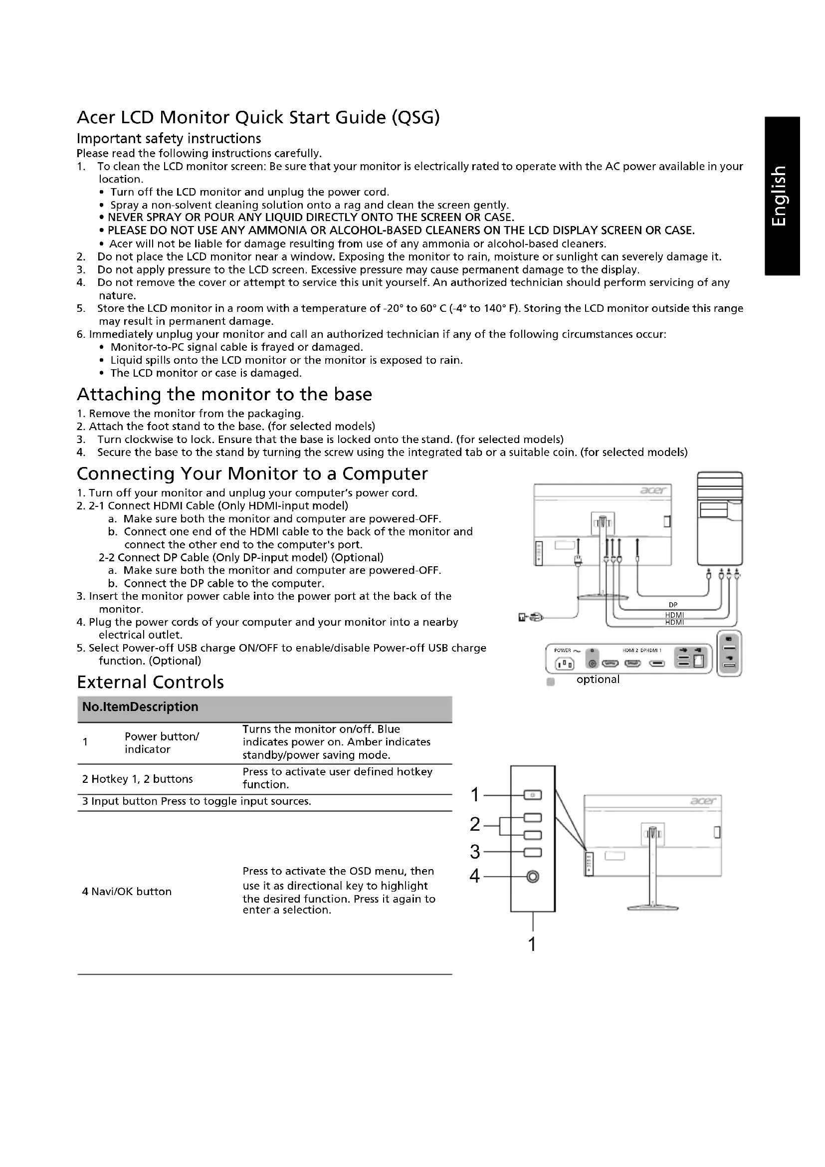Connecting Your Monitor to a Computer 1. Turn off your monitor and unplug your computer’s power cord.2. 2-1 Connect HDMI Cable (Only HDMI-input model)a. Make sure both the monitor and computer are powered-OFF.b. Connect one end of the HDMI cable to the back of the monitor and connect the other end to the computer's port.2-2 Connect DP Cable (Only DP-input model) (Optional)a. Make sure both the monitor and computer are powered-OFF.b. Connect the DP cable to the computer.3. Insert the monitor power cable into the power port at the back of the monitor.4. Plug the power cords of your computer and your monitor into a nearby electrical outlet. 5. Select Power-off USB charge ON/OFF to enable/disable Power-off USB charge function. (Optional) External Controls No. Item Description