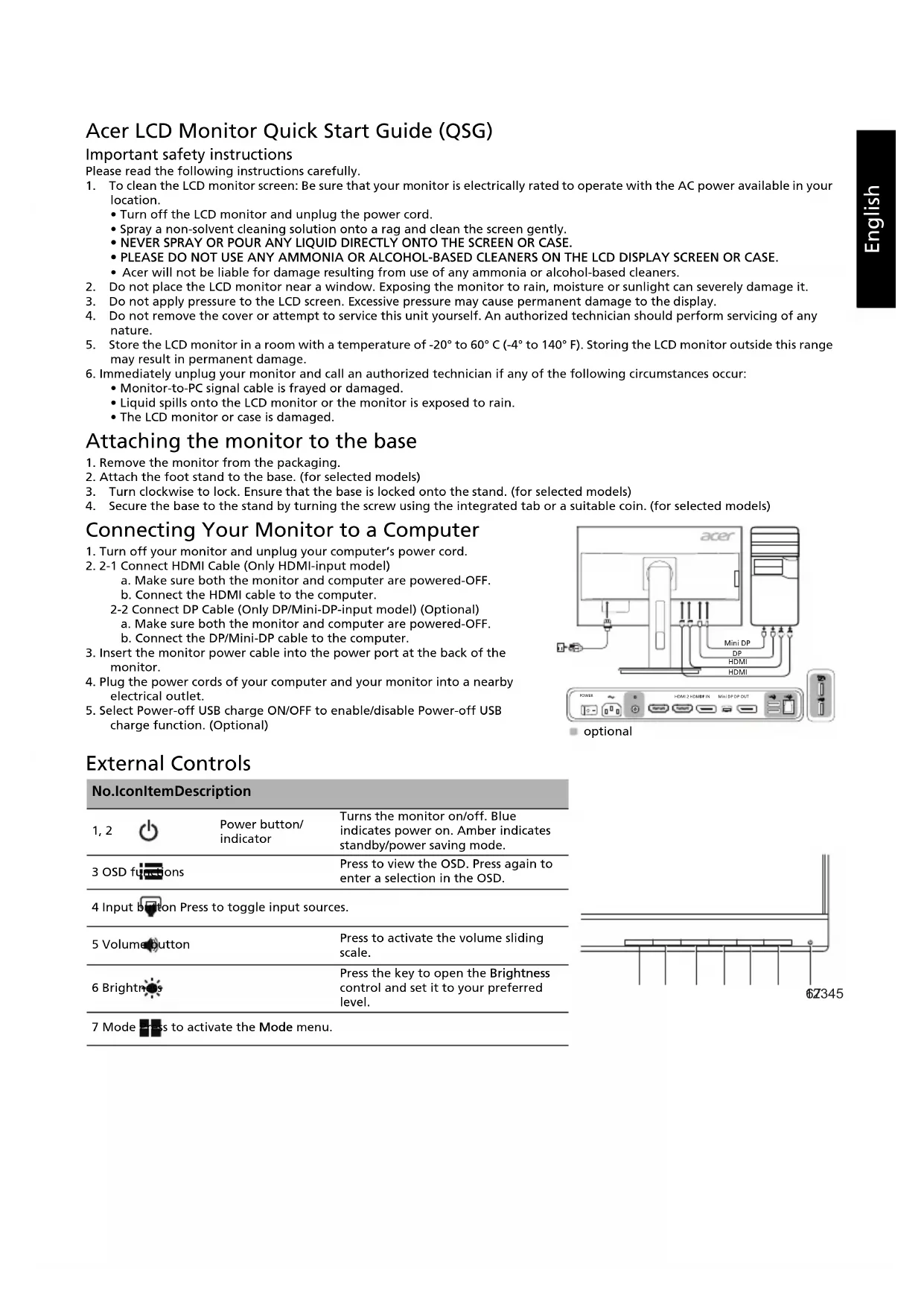 English Acer LCD Monitor Quick Start Guide (QSG) Important safety instructions Please read the following instructions carefully. 1. To clean the LCD monitor screen: Be sure that your monitor is electrically rated to operate with the AC power available in your location.• Turn off the LCD monitor and unplug the power cord.• Spray a non-solvent cleaning solution onto a rag and clean the screen gently.