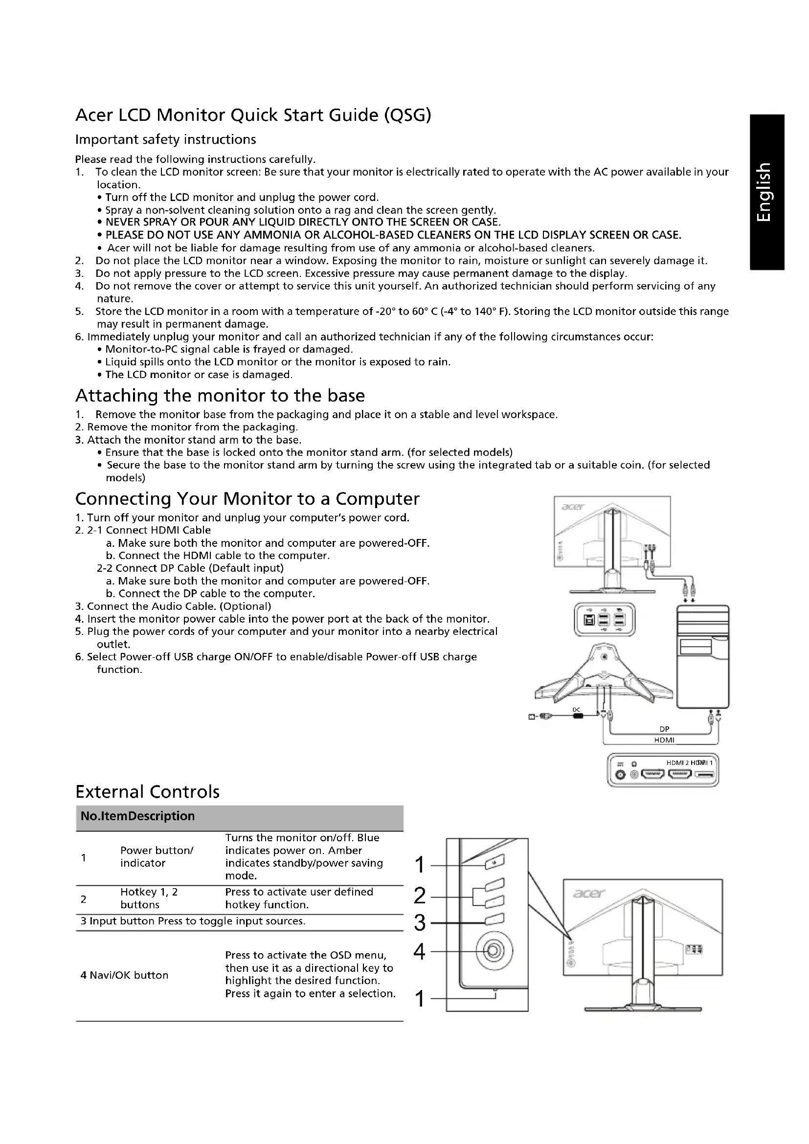 English Acer LCD Monitor Quick Start Guide (QSG) Important safety instructions Please read the following instructions carefully. 1. To clean the LCD monitor screen: Be sure that your monitor is electrically rated to operate with the AC power available in your location.• Turn off the LCD monitor and unplug the power cord.• Spray a non-solvent cleaning solution onto a rag and clean the screen gently.