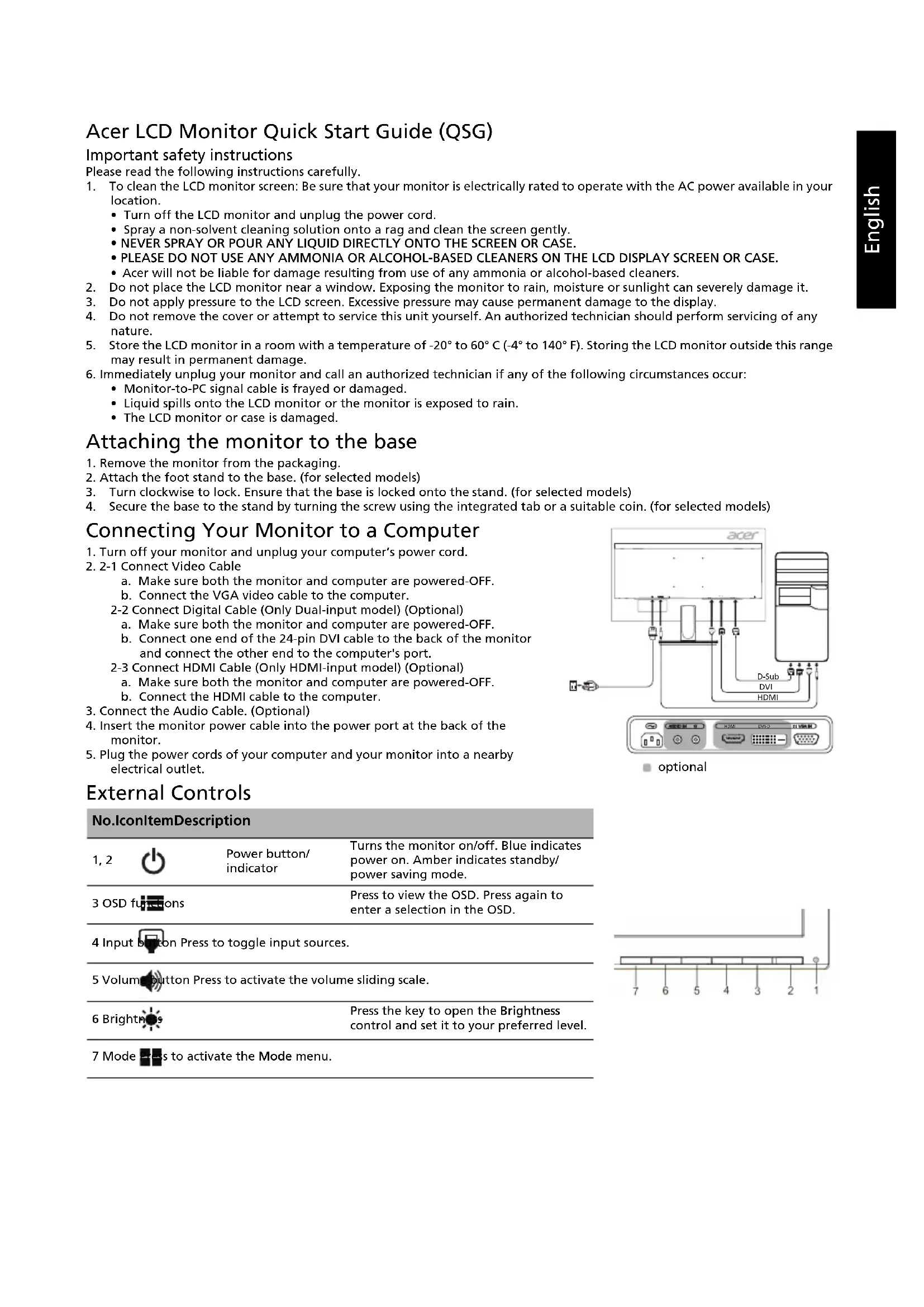 K 2 4 2 H Y LEnglish Acer LCD Monitor Quick Start Guide (QSG) Important safety instructions Please read the following instructions carefully. 1. To clean the LCD monitor screen: Be sure that your monitor is electrically rated to operate with the AC power available in your location.