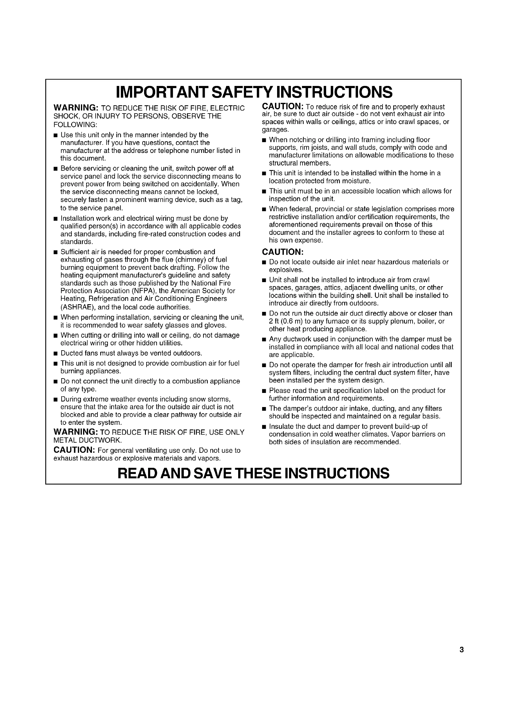 SHOCK, OR INJURY TO PERSONS, OBSERVE THE FOLLOWING: ■ Use this unit only in the manner intended by the manufacturer. If you have questions, contact the manufacturer at the address or telephone number listed in this document. ■ Before servicing or cleaning the unit, switch power off at service panel and lock the service disconnecting means to prevent power from being switched on accidentally. When the service disconnecting means cannot be locked, securely fasten a prominent warning device, such as a tag, to the service panel. ■ Installation work and electrical wiring must be done by qualified person(s) in accordance with all applicable codes and standards, including fire-rated construction codes and standards. ■ Sufficient air is needed for proper combustion and exhausting of gases through the flue (chimney) of fuel burning equipment to prevent back drafting. Follow the heating equipment manufacturer's guideline and safety standards such as those published by the National Fire Protection Association (NFPA), the American Society for Heating, Refrigeration and Air Conditioning Engineers (ASHRAE), and the local code authorities. ■ When performing installation, servicing or cleaning the unit, it is recommended to wear safety glasses and gloves. ■ When cutting or drilling into wall or ceiling, do not damage electrical wiring or other hidden utilities. ■ Ducted fans must always be vented outdoors.■ This unit is not designed to provide combustion air for fuel burning appliances. ■ Do not connect the unit directly to a combustion appliance of any type. ■ During extreme weather events including snow storms, ensure that the intake area for the outside air duct is not blocked and able to provide a clear pathway for outside air to enter the system.