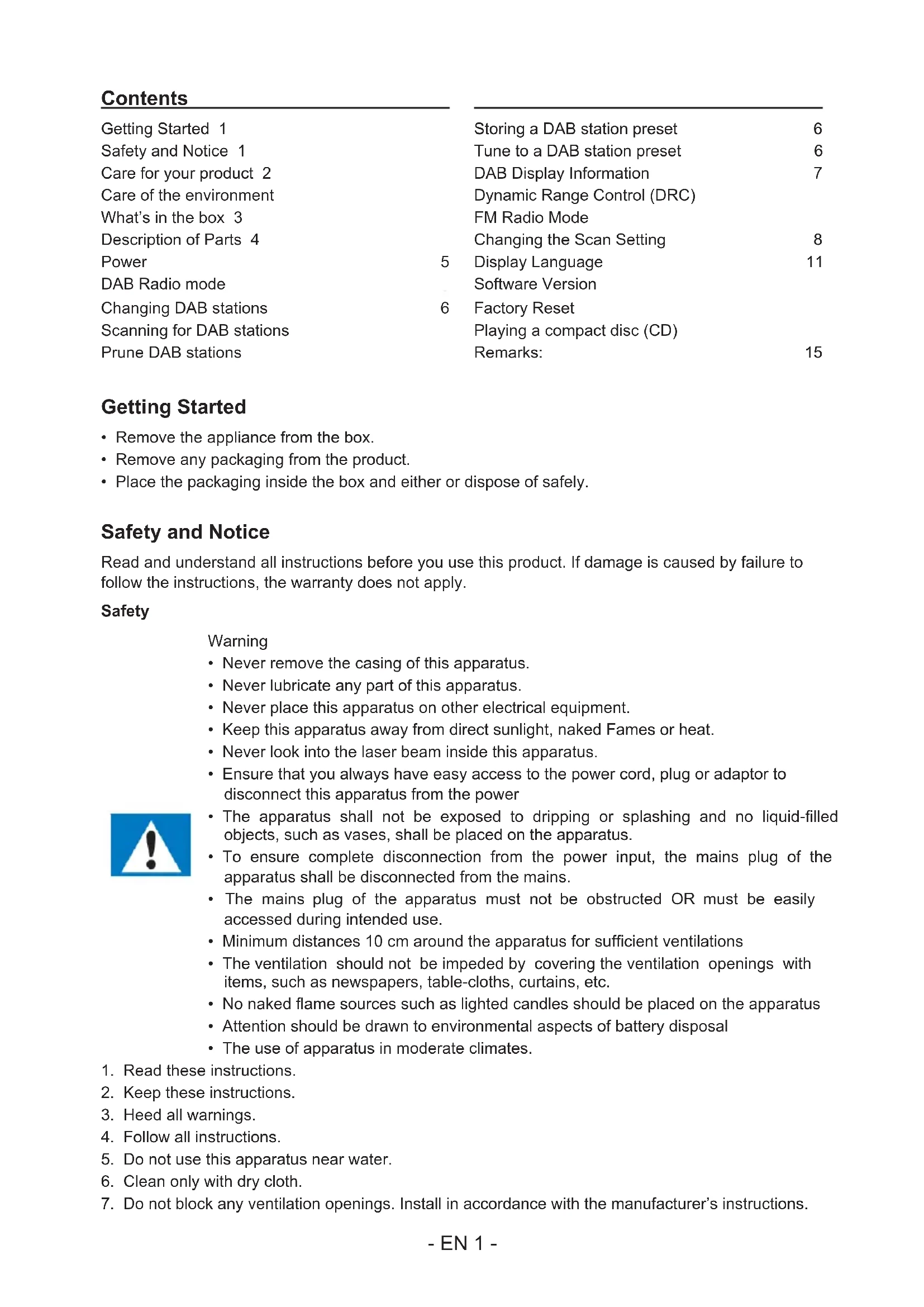 Getting Started 1 Safety and Notice 1 Care for your product 2 Care of the environment 2 What’s in the box 3 Description of Parts 4 Power 5 DAB Radio mode 5 Changing DAB stations 6 Scanning for DAB stations 6 Prune DAB stations 6 Storing a DAB station preset 6 Tune to a DAB station preset 6 DAB Display Information 7 Dynamic Range Control (DRC) 7 FM Radio Mode 7 Changing the Scan Setting 8 Display Language 11 Software Version 11 Factory Reset 11 Playing a compact disc (CD) 11 Remarks: 15 Contents- EN 2 -