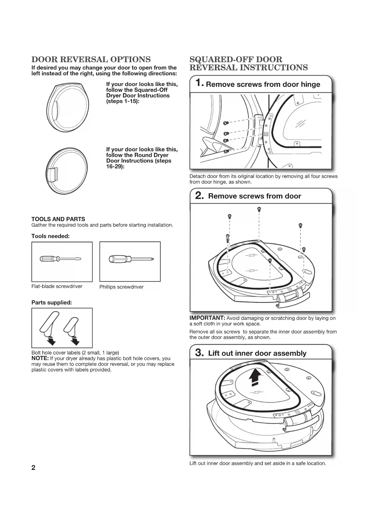 If desired you may change your door to open from the left instead of the right, using the following directions: If your door looks like this, follow the Squared-Off Dryer Door Instructions (steps 1-15): If your door looks like this, follow the Round Dryer Door Instructions (steps 16-29): Remove screws from door hinge