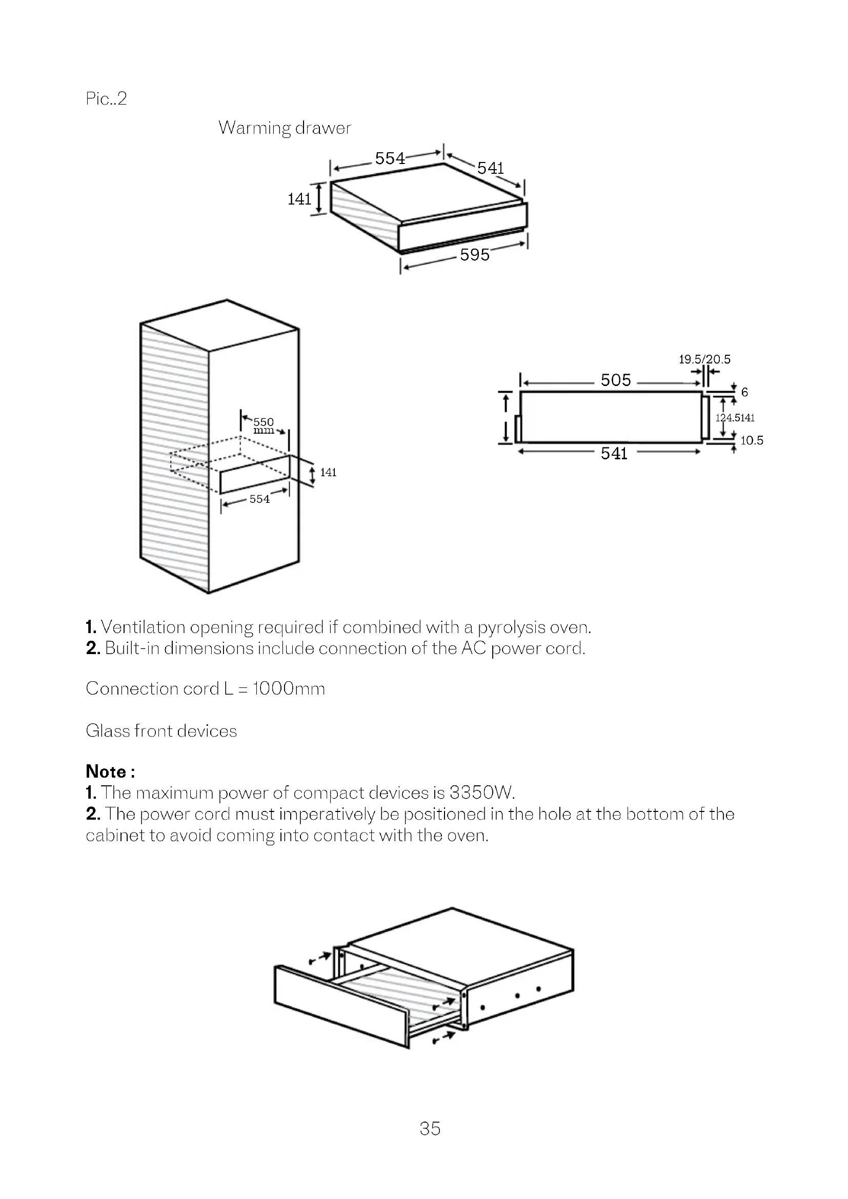 Pic.1-Pic.2 The warming drawer may only be installed in combination with the devices indicated as suitable by the manufacturer. The manufacturer does not guarantee trouble-free use if the device is used in combination with devices other than those indicated by the manufacturer as suitable. When installing the warming drawer in combination with another suitable appliance, the warming Check that it can support the combined weight of the drawer and the other appliance. As the combo unit is placed directly above the warming drawer once it is built in, an intermediate shelf is not required between the two units. hat the contents of the drawer cannot be seen. This helps prevent burns from hot food splashes. There must be enough space to be able to fully open the drawer. The built-in dimensions for the warming drawer must be added to the built-in dimensions for the combination device in order to establish the required niche size. All dimensions provided in this manual are indicated in mm.