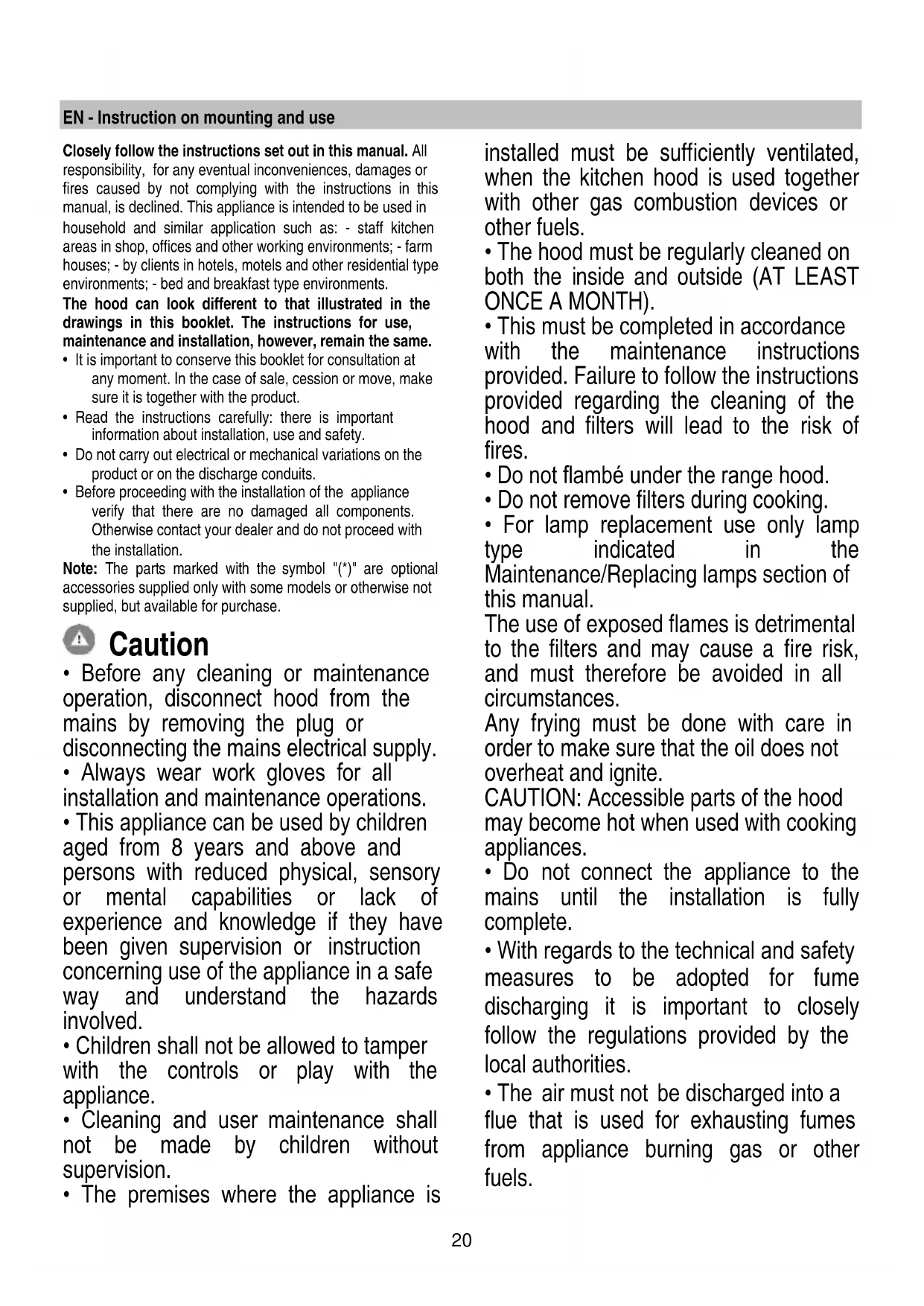 - Before any cleaning or maintenance operation, disconnect hood from the mains by removing the plug or disconnecting the mains electrical supply.