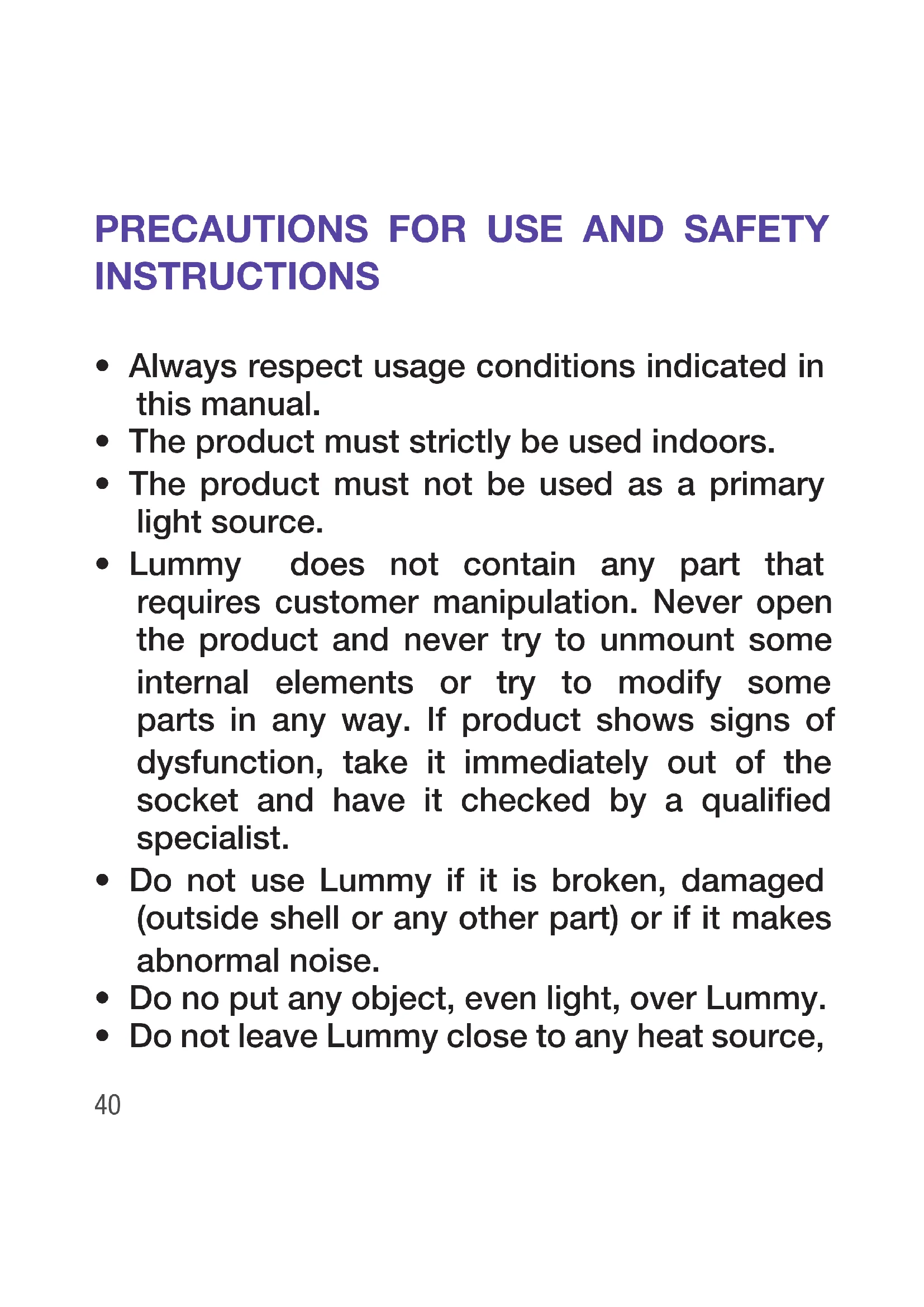 - Do not leave Lummy close to any heat source,41