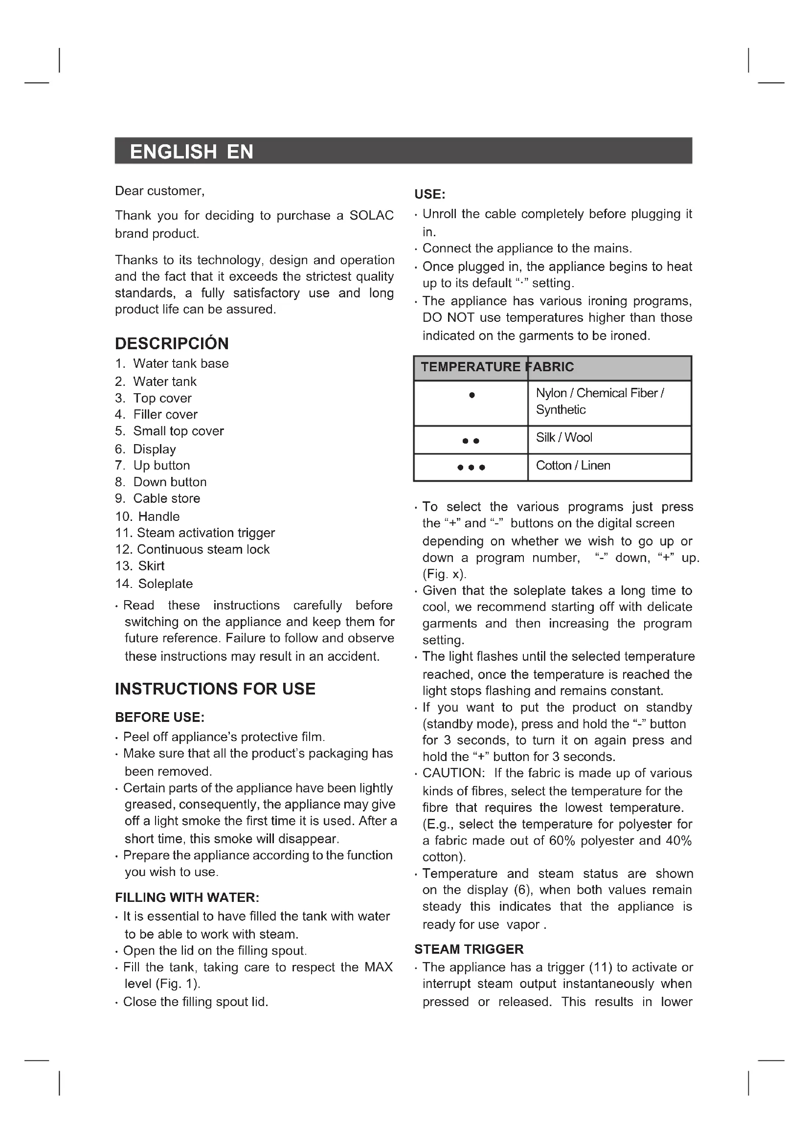 - The product does not contain concentrations of substances that could be considered harmful to the environmentEN This symbol means that if you wish to dispose of the product once its useful life has ended, it must be deposited with an authorised waste management agent for the selective collection of Waste Electrical and Electronic Equipment (WEEE) This symbol indicates that the surface may heat up during use. This appliance complies with Directive 2014/35/ EU on Low Voltage, with Directive 2014/30/EU on Electromagnetic Compatibility, with Directive 2011/65/EU on restrictions on the use of certain dangerous substances in electrical and electronic appliances and with Directive 2009/125/EC on the ecological design requirements applicable to products related to energy.Cher Client, Nous vous remercions d’avoir acheté un produit SOLAC. Sa technologie, son design et ses fonctionnalité, associés aux plus hautes normes de qualité vous permettront une totale satisfaction pendant longtemps. DESCRIPTION