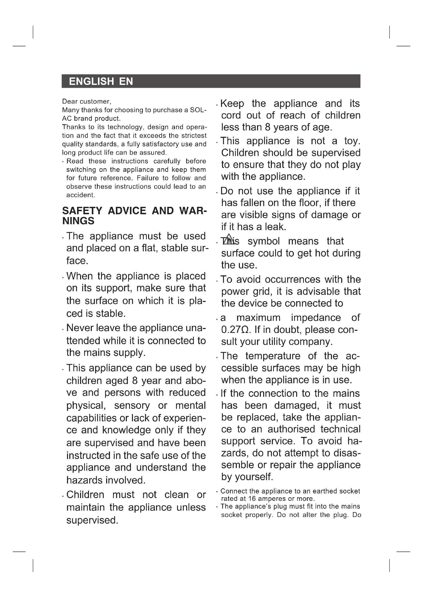 ASSISTANCE This product enjoys the recognition and protec- tion of the legal guarantee in accordance with current legislation. To enforce your rights or inte- rests you must go to any of our ofcial technical assistance services. You can nd the closest one by accessing the following web link: http://solac.com You can also request related information by con- tacting us by phone. You can download this instruction manual and its updates at http://solac.com