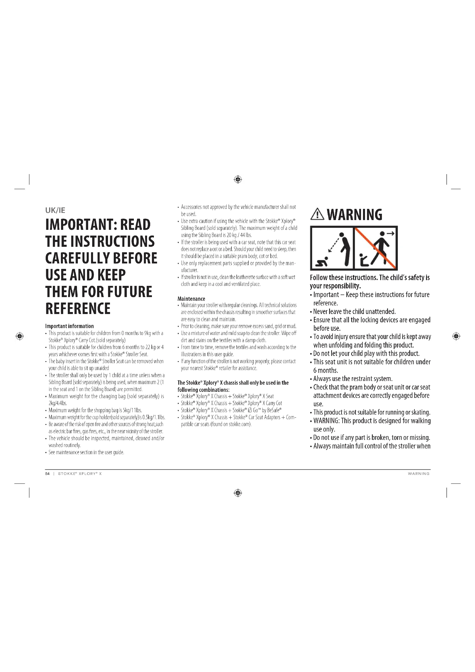 If stroller is not in use, clean the leatherette surface with a soft wet cloth and keep in a cool and ventilated place. Maintenance Regularly maintain your stroller by cleaning it. Ensure that all functions work properly.The vehicle should be inspected, maintained, cleaned and/or washed routinely. If any defects are found, contact your retailer. Only use the Stokke® Xplory® chassis in the following combinations: