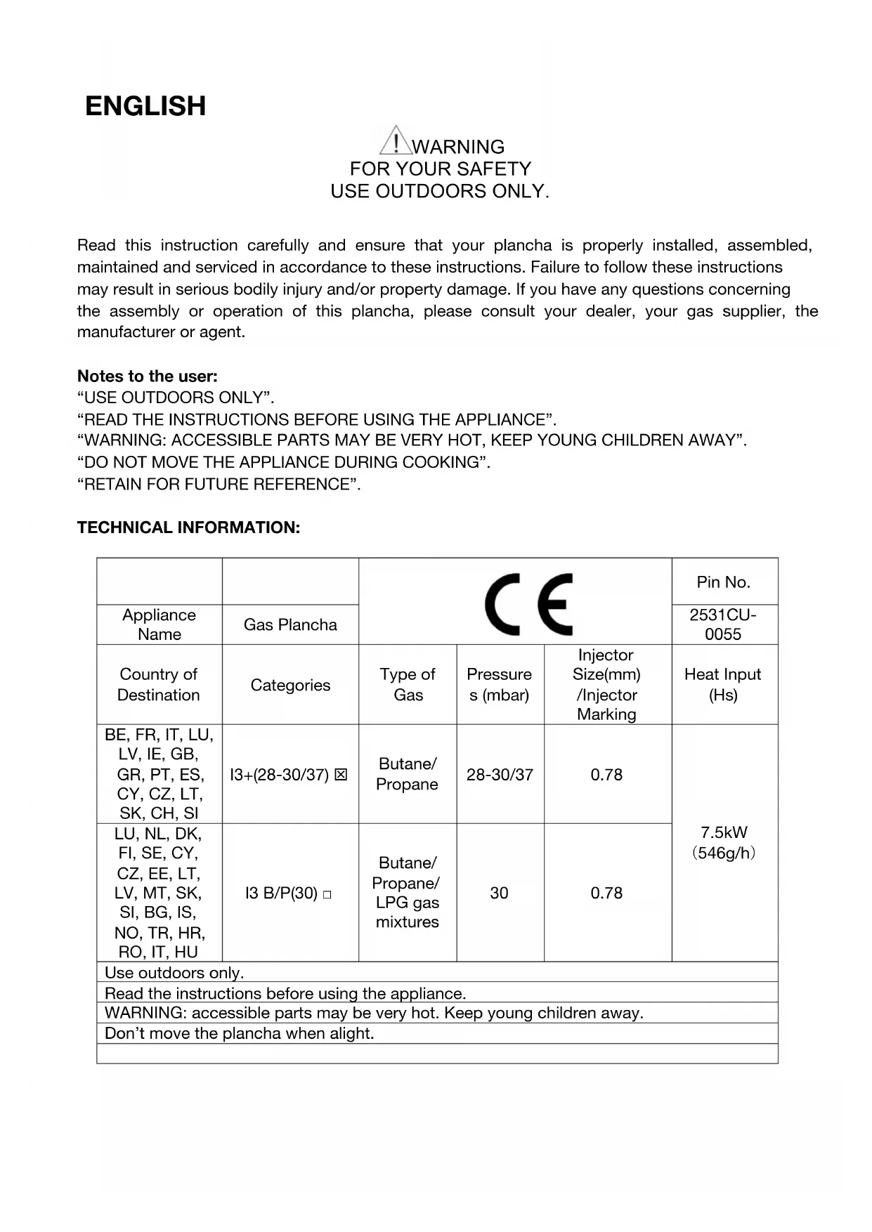 Read this instruction carefully and ensure that your plancha is properly installed, assembled, maintained and serviced in accordance to these instructions. Failure to follow these instructions may result in serious bodily injury and/or property damage. If you have any questions concerning the assembly or operation of this plancha, please consult your dealer, your gas supplier, the manufacturer or agent. Notes to the user: “USE OUTDOORS ONLY”. “READ THE INSTRUCTIONS BEFORE USING THE APPLIANCE”. “WARNING: ACCESSIBLE PARTS MAY BE VERY HOT, KEEP YOUNG CHILDREN AWAY”. “DO NOT MOVE THE APPLIANCE DURING COOKING”. “RETAIN FOR FUTURE REFERENCE”. TECHNICAL INFORMATION: