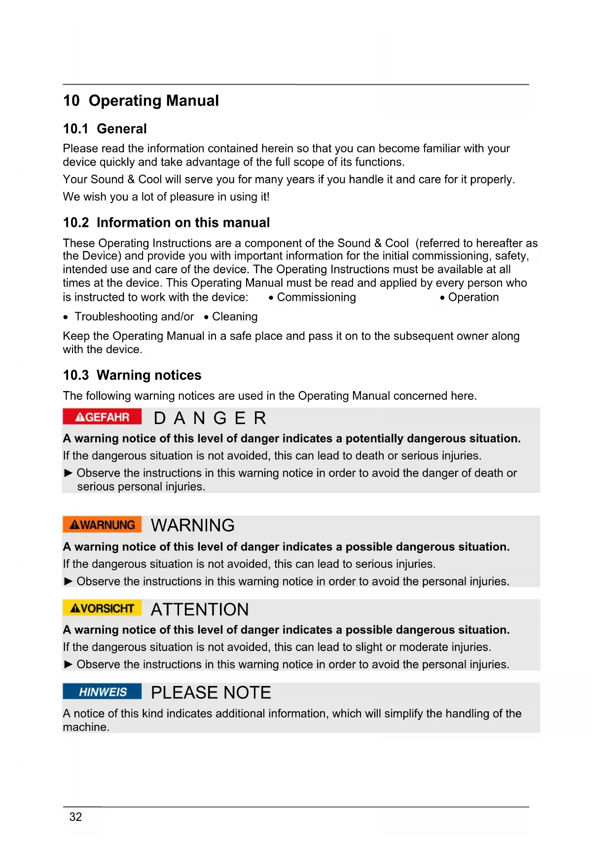 These Operating Instructions are a component of the Sound & Cool (referred to hereafter as the Device) and provide you with important information for the initial commissioning, safety, intended use and care of the device. The Operating Instructions must be available at all times at the device. This Operating Manual must be read and applied by every person who is instructed to work with the device: Commissioning Operation Troubleshooting and/or Cleaning Keep the Operating Manual in a safe place and pass it on to the subsequent owner along with the device.