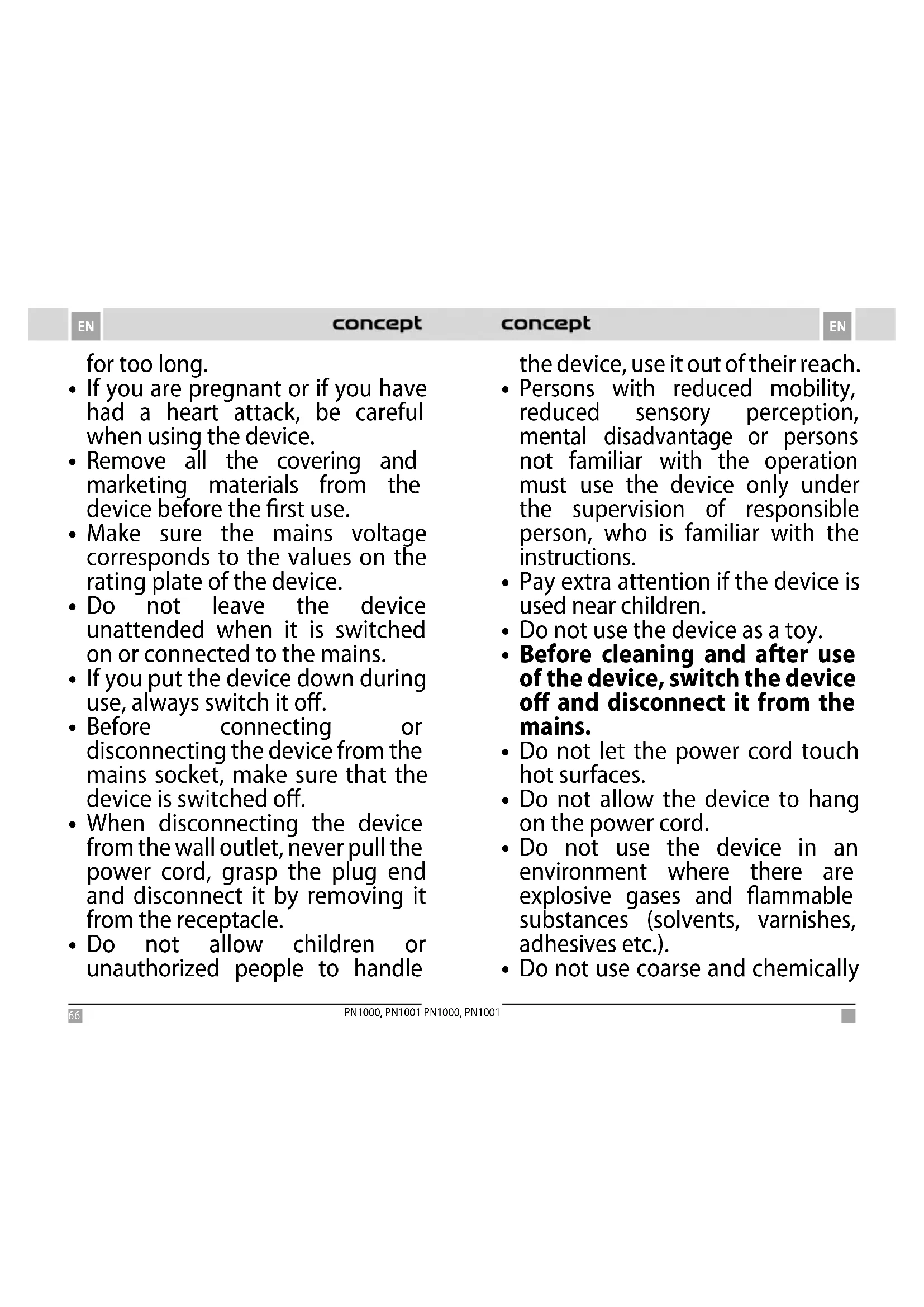 - Do not use the device on one area66 67 PN1000, PN1001 PN1000, PN1001 ENEN for too long.