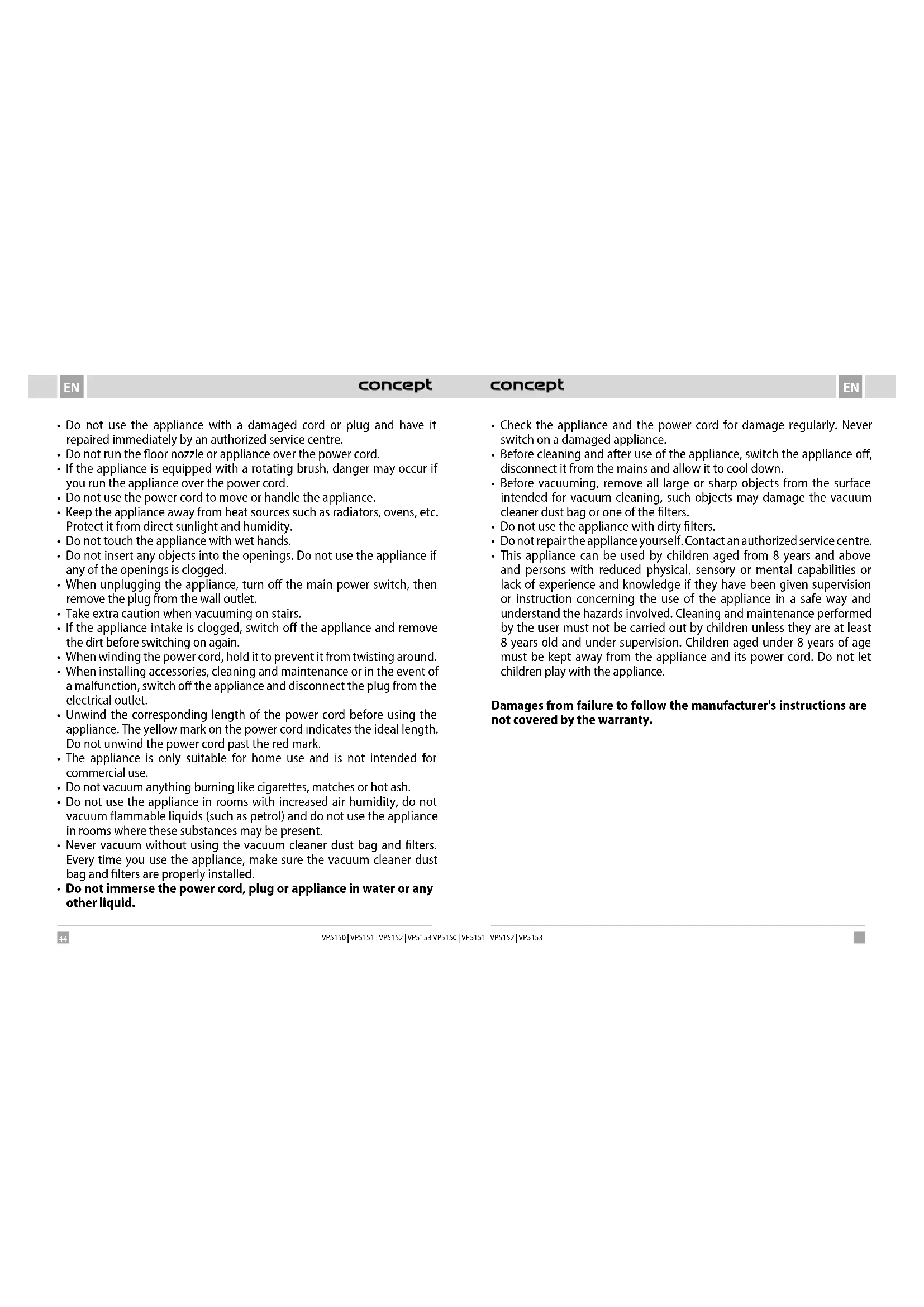 VP5150 | VP5151 | VP5152 | VP5153 ACKNOWLEDGEMENTS Thank you for purchasing a Concept product. We wish you much joy with your new appliance every day you use it. Please read the instruction manual carefully before initial use. To refer to this manual any time you need to, we recommend you to keep it in a safe place. And please pass it to any future owner of the appliance. Technical specifications Voltage 220–240 V ~ 50-60 Hz Input 800 W Sound performance level ≤78 dB