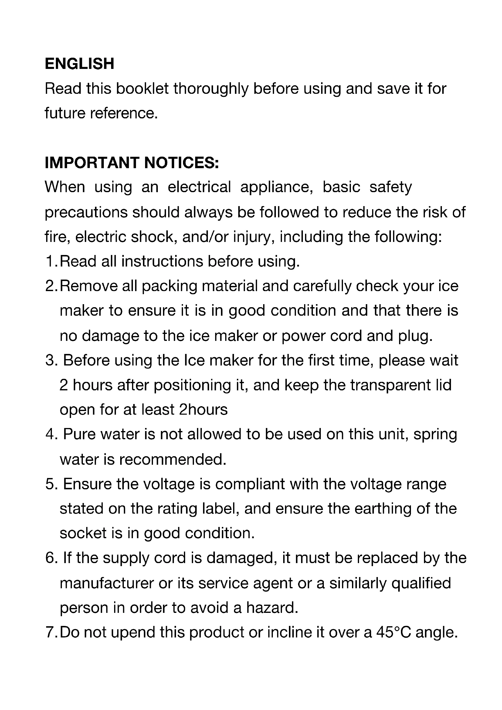 - Before using the Ice maker for the first time, please wait 2 hours after positioning it, and keep the transparent lid open for at least 2 hours