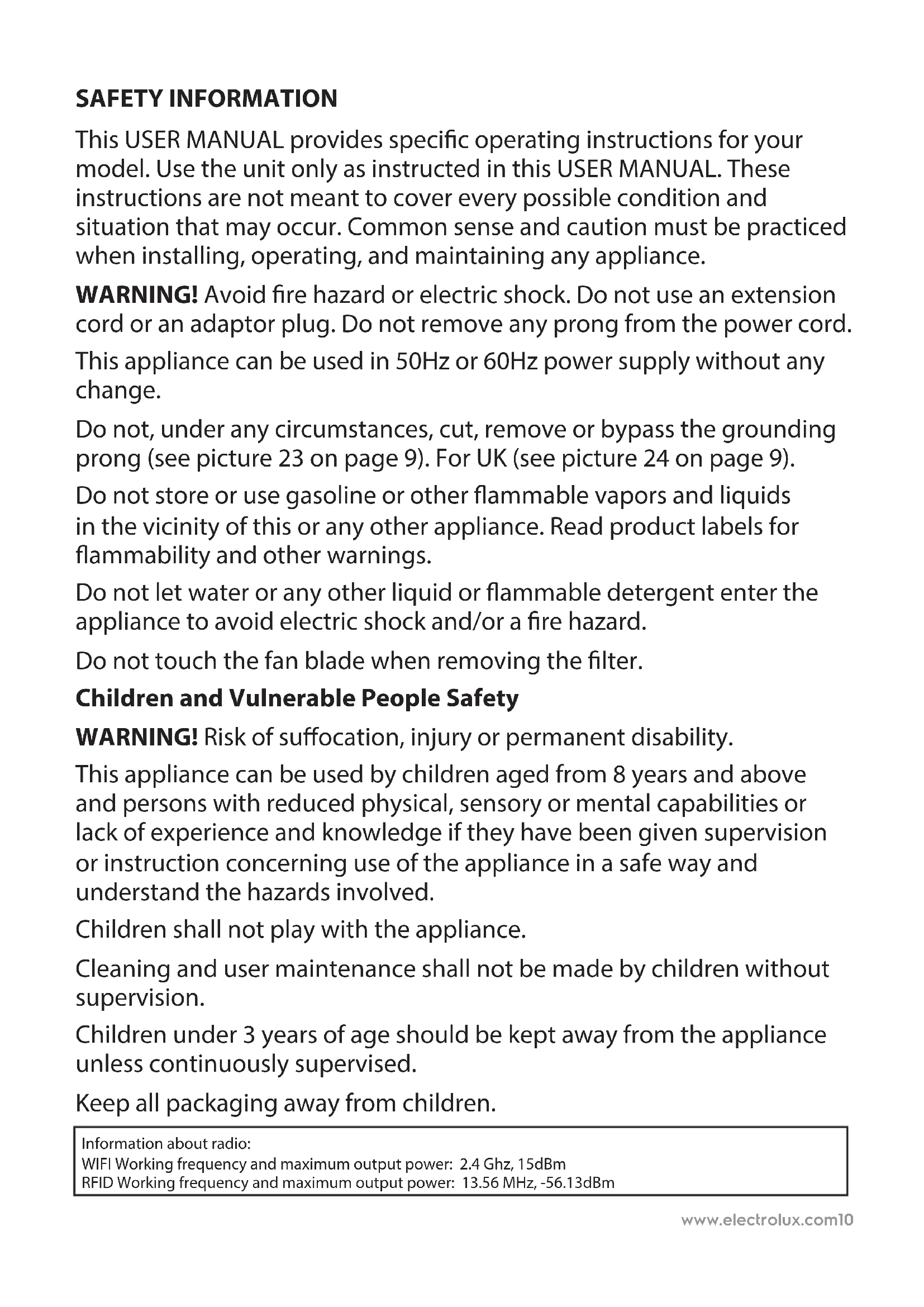 13www.electrolux.com10 SAFETY INFORMATION This USER MANUAL provides specic operating instructions for your model. Use the unit only as instructed in this USER MANUAL. These instructions are not meant to cover every possible condition and situation that may occur. Common sense and caution must be practiced when installing, operating, and maintaining any appliance. WARNING! Avoid re hazard or electric shock. Do not use an extension cord or an adaptor plug. Do not remove any prong from the power cord. This appliance can be used in 50Hz or 60Hz power supply without any change. Do not, under any circumstances, cut, remove or bypass the grounding prong (see picture 23 on page 9). For UK (see picture 24 on page 9). Do not store or use gasoline or other ammable vapors and liquids in the vicinity of this or any other appliance. Read product labels for ammability and other warnings. Do not let water or any other liquid or ammable detergent enter the appliance to avoid electric shock and/or a re hazard. Do not touch the fan blade when removing the lter. Children and Vulnerable People Safety WARNING! Risk of suocation, injury or permanent disability. This appliance can be used by children aged from 8 years and above and persons with reduced physical, sensory or mental capabilities or lack of experience and knowledge if they have been given supervision or instruction concerning use of the appliance in a safe way and understand the hazards involved. Children shall not play with the appliance. Cleaning and user maintenance shall not be made by children without supervision. Children under 3 years of age should be kept away from the appliance unless continuously supervised. Keep all packaging away from children. Information about radio: WIFI Working frequency and maximum output power: 2.4 Ghz, 15dBm RFID Working frequency and maximum output power: 13.56 MHz, -56.13dBmwww.electrolux.com 11 Electrical Information WARNING! Avoid re hazard or electric shock. If you are not sure the outlet is adequately grounded or protected by a time delay fuse or circuit breaker, have a qualied electrician install the proper outlet according to the National Electrical Code and applicable local codes and ordinances. Do not use an extension cord or an adapter plug. Never unplug the unit by pulling on the power cord. Always grip the plug rmly and pull straight out from the receptacle. Do not pinch, bend, or knot the power cord. Do not cut or damage the power cord. If the power cord is damaged, it should only be replaced by an authorized Electrolux servicer. This unit contains no user- serviceable parts. Always call an authorized Electrolux servicer for repairs. If the supply cord is damaged, it must be replaced by the manufacturer, its service agent or similarly qualied persons in order to avoid a hazard. Be sure to unplug the unit before cleaning to prevent shock or re hazards. ENGLISH Thank you for choosing the Electrolux air purier PURE A9-40/PURE A9-60. Always use original accessories and spare parts to get the best results. This product is designed with the environment in mind. All plastic parts are marked for recycling purposes. BEFORE STARTING