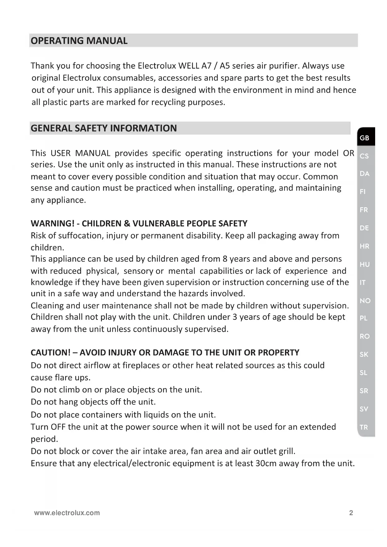 Models: WA51-303 & WA51-304 series WA71-304 & WA71-305 series Instruction book Mode d’emploiOPERATING MANUAL Thank you for choosing the Electrolux WELL A7 / A5 series air purifier. Always use original Electrolux consumables, accessories and spare parts to get the best results out of your unit. This appliance is designed with the environment in mind and hence all plastic parts are marked for recycling purposes.