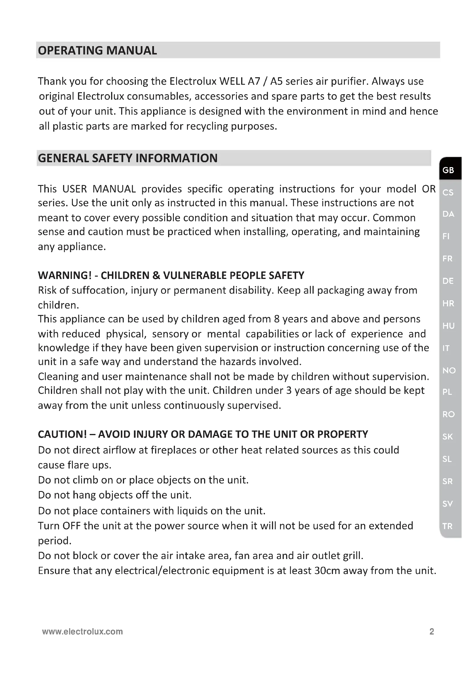 Models: WA51-303 & WA51-304 series WA71-304 & WA71-305 series Instruction book Mode d’emploiOPERATING MANUAL Thank you for choosing the Electrolux WELL A7 / A5 series air purifier. Always use original Electrolux consumables, accessories and spare parts to get the best results out of your unit. This appliance is designed with the environment in mind and hence all plastic parts are marked for recycling purposes.