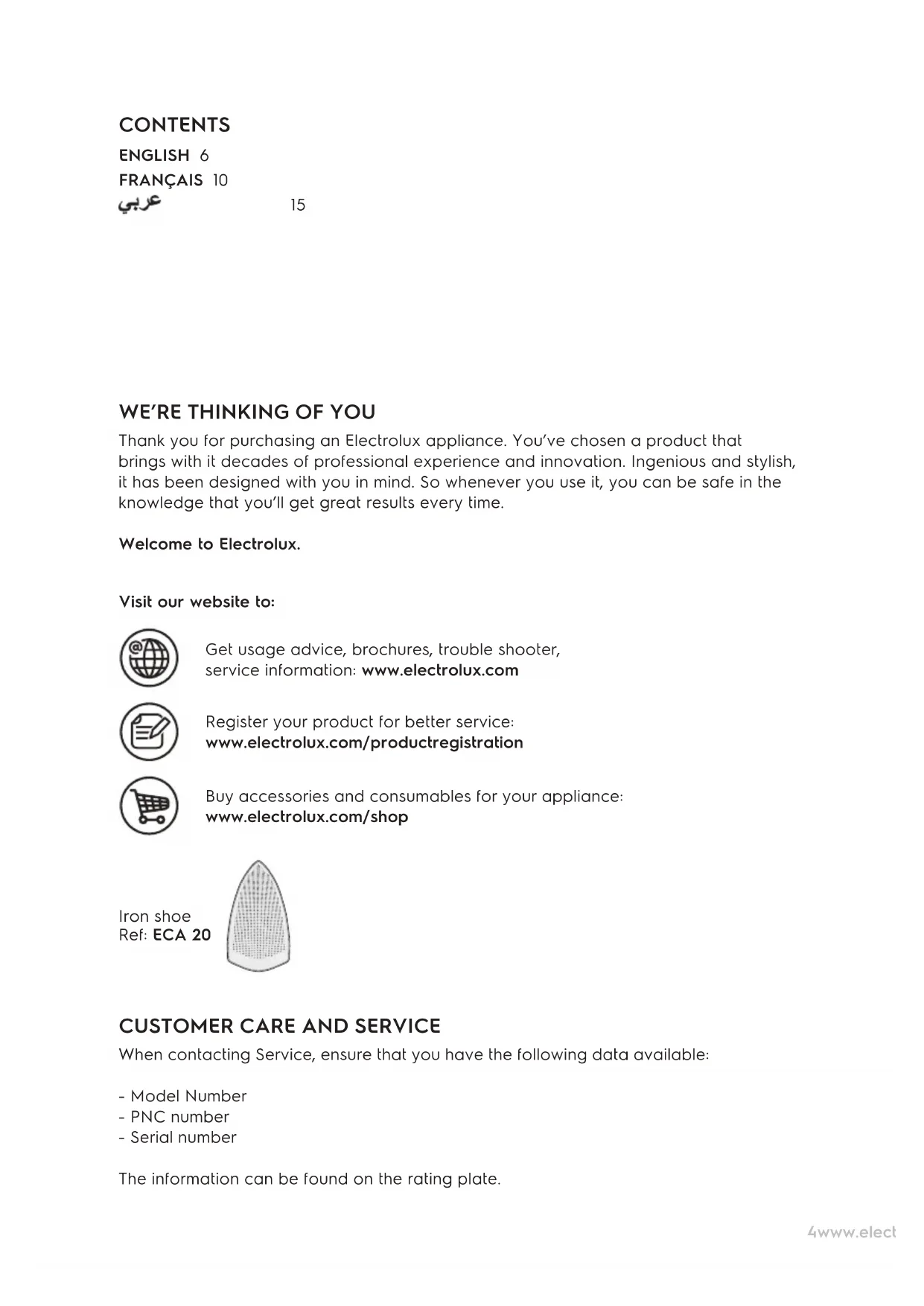 114www.electrolux.com Visit our website to: Get usage advice, brochures, trouble shooter, service information: www.electrolux.com Register your product for better service: www.electrolux.com/productregistration Buy accessories and consumables for your appliance: www.electrolux.com/shop CONTENTS ENGLISH 6 FRANÇAIS 10