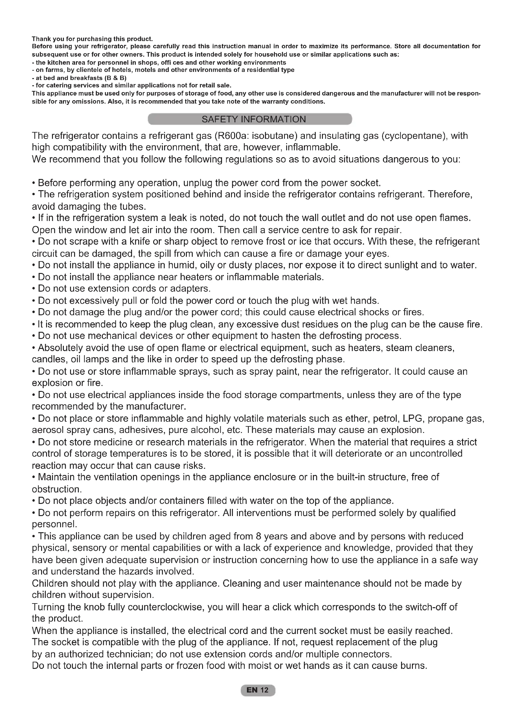 Thank you for purchasing this product. Before using your refrigerator, please carefully read this instruction manual in order to maximize its performance. Store all documentation for subsequent use or for other owners. This product is intended solely for household use or similar applications such as: - the kitchen area for personnel in shops, offi ces and other working environments - on farms, by clientele of hotels, motels and other environments of a residential type - at bed and breakfasts (B & B) - for catering services and similar applications not for retail sale. This appliance must be used only for purposes of storage of food, any other use is considered dangerous and the manufacturer will not be respon- sible for any omissions. Also, it is recommended that you take note of the warranty conditions. The refrigerator contains a refrigerant gas (R600a: isobutane) and insulating gas (cyclopentane), with high compatibility with the environment, that are, however, inflammable. We recommend that you follow the following regulations so as to avoid situations dangerous to you: