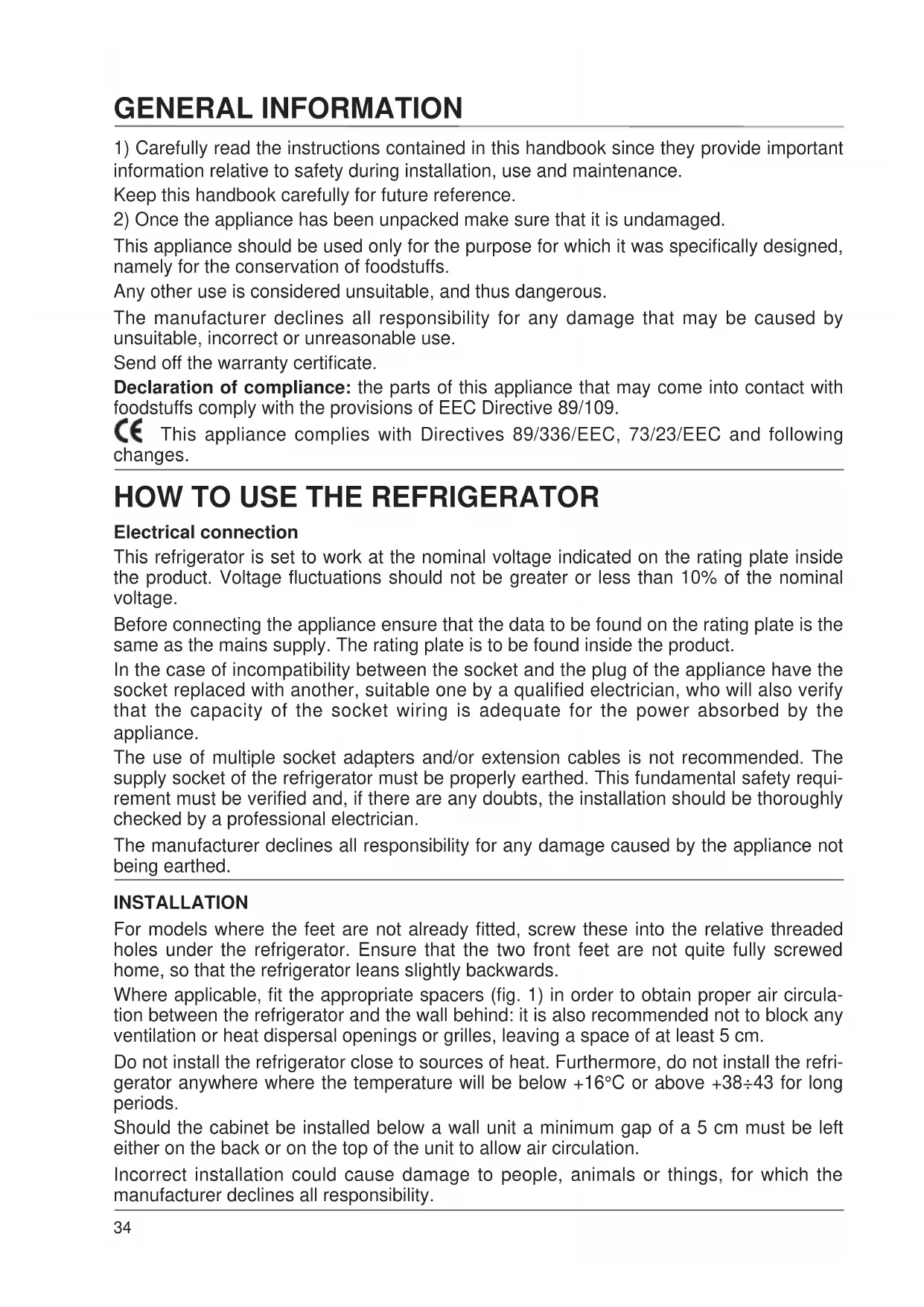 This appliance should be used only for the purpose for which it was specifically designed, namely for the conservation of foodstuffs. Any other use is considered unsuitable, and thus dangerous. The manufacturer declines all responsibility for any damage that may be caused by unsuitable, incorrect or unreasonable use. Send off the warranty certificate. Declaration of compliance: the parts of this appliance that may come into contact with foodstuffs comply with the provisions of EEC Directive 89/109. This appliance complies with Directives 89/336/EEC, 73/23/EEC and following changes.