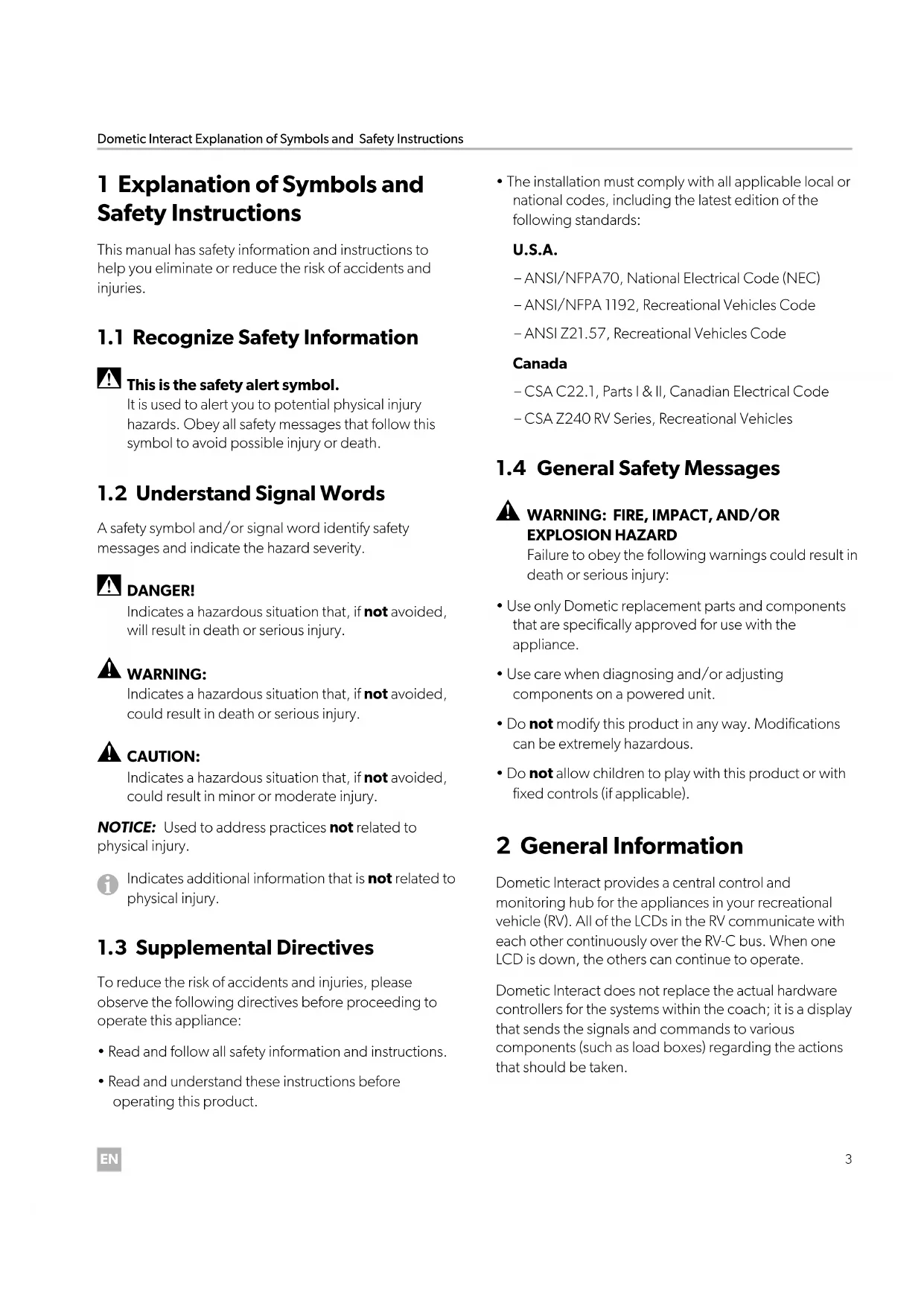 EXPLOSION HAZARD Failure to obey the following warnings could result in death or serious injury:Intended Use Dometic Interact
