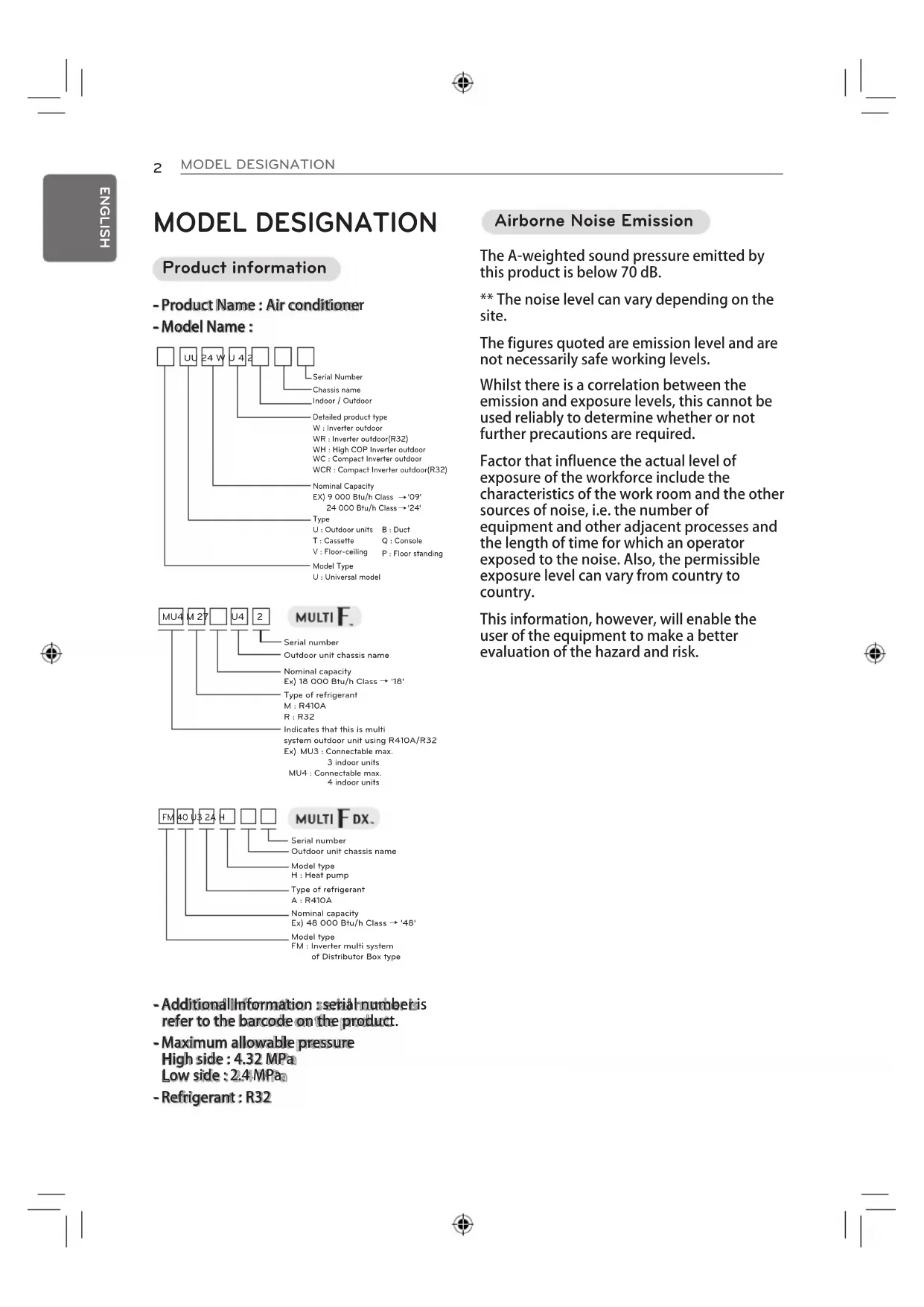 ow side : 2.4 MPa - Refrigerant : R32 Product information UU 24 W U 4 2 Serial NumberIndoor / OutdoorDetailed product typeW : Inverter outdoorWR : Inverter outdoor(R32)WH : High COP Inverter outdoorWC : Compact Inverter outdoor WCR : Compact Inverter outdoor(R32) Nominal CapacityEX) 9 000 Btu/h Class '09' 24 000 Btu/h Class '24' Type Model TypeU : Universal modelU : Outdoor unitsT : CassetteV : Floor-ceilingB : DuctQ : Console P : Floor standingChassis nameFM 40 U3 2A HModel typeOutdoor unit chassis nameSerial numberH : Heat pumpType of refrigerantA : R410ANominal capacityEx) 48 000 Btu/h Class → '48' Model typeFM : Inverter multi system of Distributor Box type MU4 M 27 Type of refrigerantM : R410AR : R32Nominal capacityEx) 18 000 Btu/h Class → '18'Serial numberOutdoor unit chassis nameIndicates that this is multi system outdoor unit using R410A/R32 Ex) MU3 : Connectable max. 3 indoor units MU4 : Connectable max. 4 indoor units U4 2 The A-weighted sound pressure emitted by this product is below 70 dB. ** The noise level can vary depending on the site. The figures quoted are emission level and are not necessarily safe working levels. Whilst there is a correlation between the emission and exposure levels, this cannot be used reliably to determine whether or not further precautions are required. Factor that influence the actual level of exposure of the workforce include the characteristics of the work room and the other sources of noise, i.e. the number of equipment and other adjacent processes and the length of time for which an operator exposed to the noise. Also, the permissible exposure level can vary from country to country. This information, however, will enable the user of the equipment to make a better evaluation of the hazard and risk. Airborne Noise EmissionSAFETY INSTRUCTIONS
