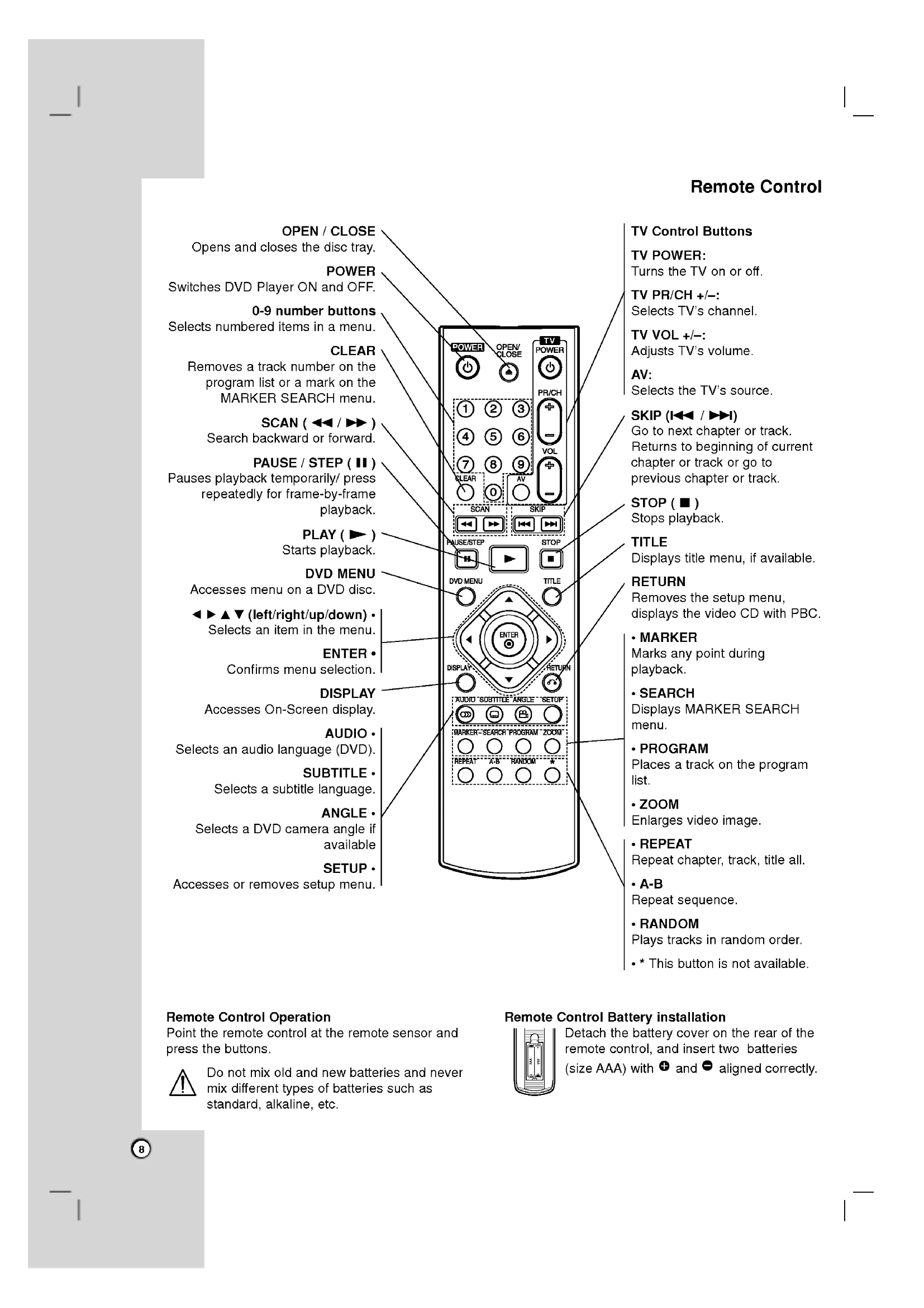 with PBC. MARKER Marks any point during playback. SEARCH Displays MARKER SEARCH menu.? PROGRAM Places track the program list. ZOOM Enlarges video image. REPEAT Repeat chapter, track, title all. A-B Repeat sequence. RANDOM Plays tracks