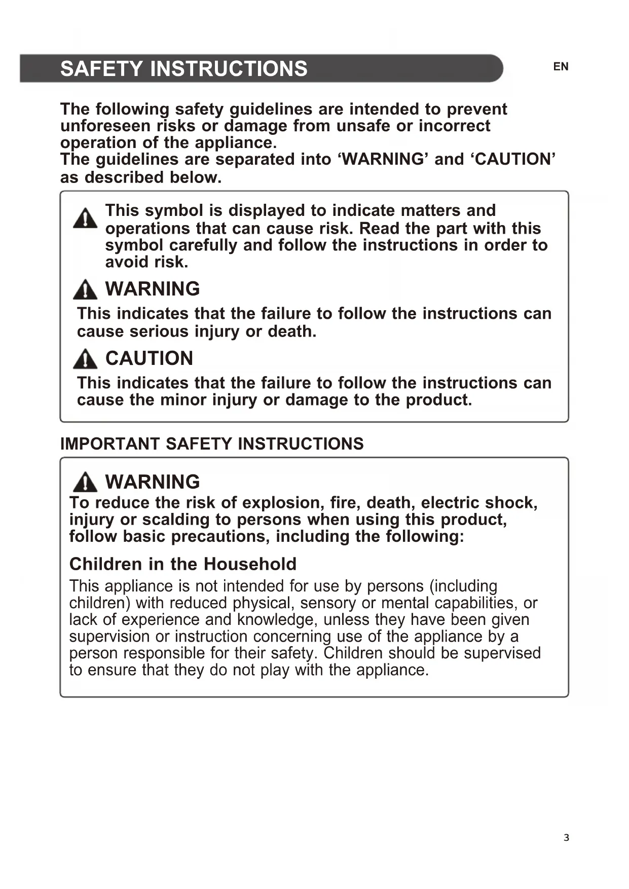 WARNING To reduce the risk of explosion, fire, death, electric shock, injury or scalding to persons when using this product, follow basic precautions, including the following: Children in the Household This appliance is not intended for use by persons (including children) with reduced physical, sensory or mental capabilities, or lack of experience and knowledge, unless they have been given supervision or instruction concerning use of the appliance by a person responsible for their safety. Children should be supervised to ensure that they do not play with the appliance.4