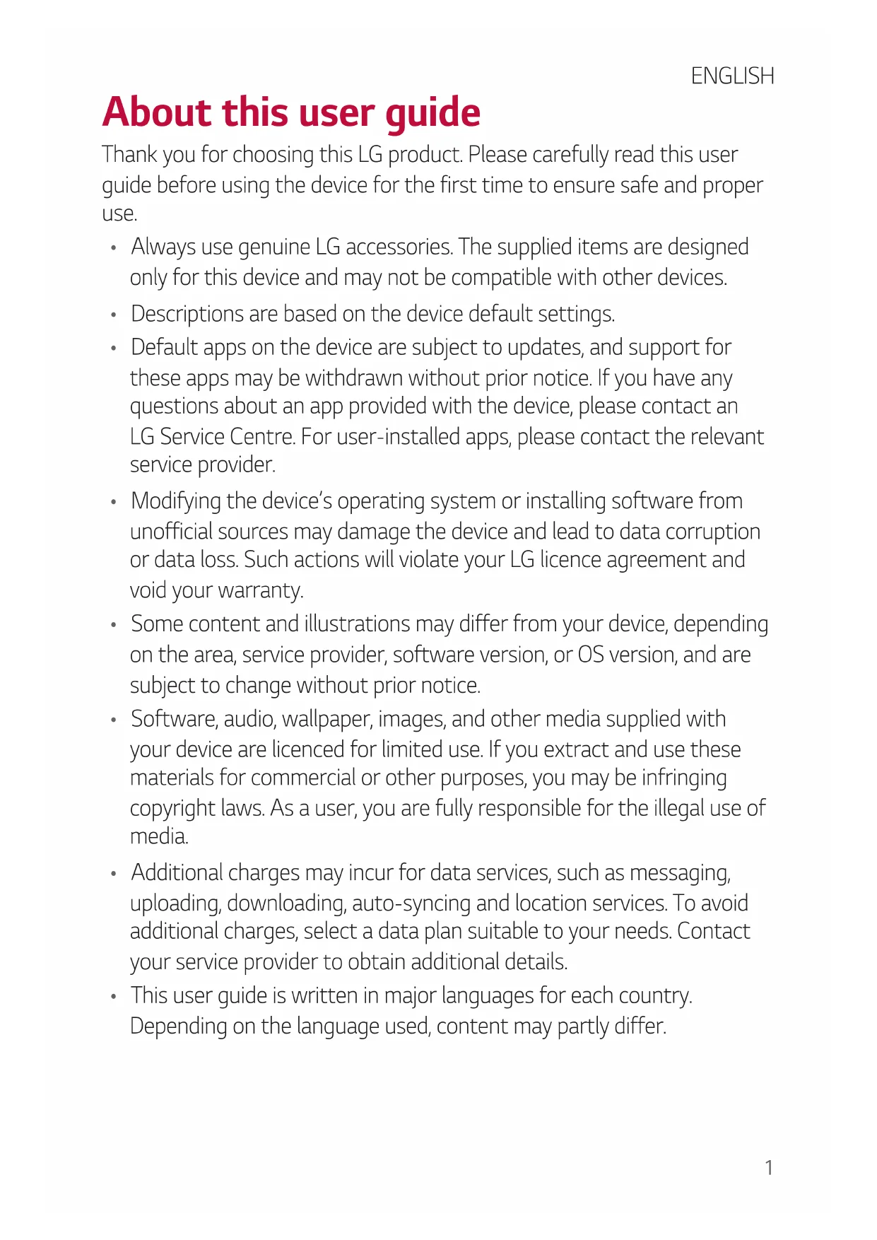 - Modifying the device’s operating system or installing software from unofficial sources may damage the device and lead to data corruption or data loss. Such actions will violate your LG licence agreement and void your warranty.