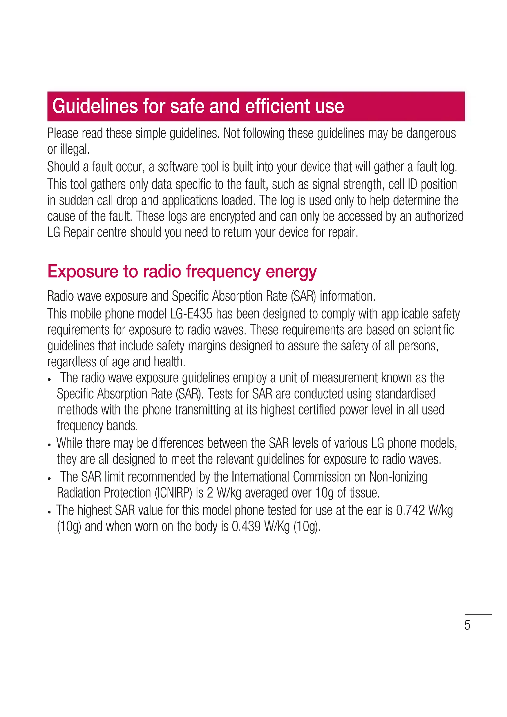 Hereby, LG Electronics declares that this LG-E435 product is in compliance with the essential requirements and other relevant provisions of Directive 1999/5/EC. A copy of the Declaration of Conformity can be found at http:// www.lg.com/global/declaration LG ELECTRONICS LEVANT-JORDAN. Abdoun, Princess Basmah St. Issam Al - Khatib complex, 3rd Floor Guidelines for safe and efficient use13 Disposal of waste batteries/accumulators 1 This symbol may be combined with chemical symbols for mercury (Hg), cadmium (Cd) or lead (Pb) if the battery contains more than 0.0005% of mercury, 0.002% of cadmium or 0.004% of lead. 2 All batteries/accumulators should be disposed separately from the municipal waste stream via designated collection facilities appointed by the government or the local authorities. 3 The correct disposal of your old batteries/accumulators will help to prevent potential negative consequences for the environment, animal and human health. 4 For more detailed information about disposal of your old batteries/ accumulators, please contact your city office, waste disposal service or the shop where you purchased the product. Disposal of your old appliance 1 All electrical and electronic products should be disposed of separately from the municipal waste stream via designated collection facilities appointed by the government or the local authorities. 2 The correct disposal of your old appliance will help prevent potential negative consequences for the environment and human health. 3 For more detailed information about disposal of your old appliance, please contact your city office, waste disposal service or the shop where you purchased the product.14 Important notice Please check to see whether any problems you encountered with your phone are described in this section before taking the phone for service or calling a service representative.