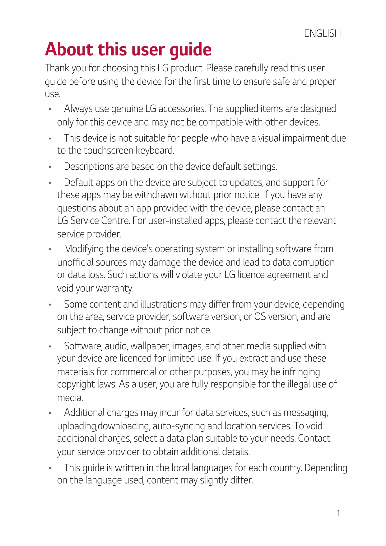 - Modifying the device’s operating system or installing software from unofficial sources may damage the device and lead to data corruption or data loss. Such actions will violate your LG licence agreement and void your warranty.