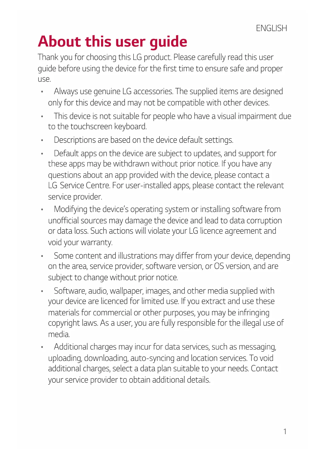 - Additional charges may incur for data services, such as messaging, uploading,downloading,auto-syncingandlocationservices.Tovoid additionalcharges,selectadataplansuitabletoyourneeds.Contact your service provider to obtain additional details. ENGLISH2About this user guide Instructional notices