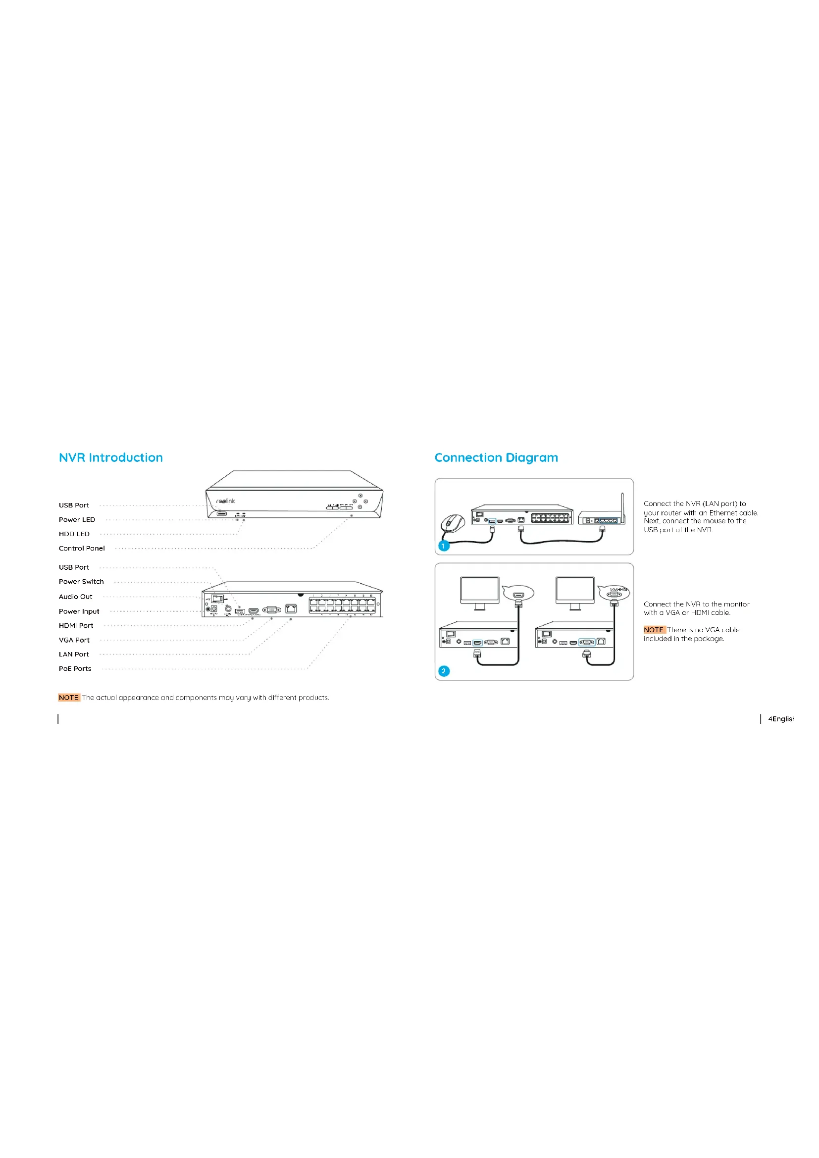 What’s in the Box4English3 English NOTE: The actual appearance and components may vary with dierent products. Connection Diagram Connect the NVR (LAN port) to your router with an Ethernet cable. Next, connect the mouse to the USB port of the NVR. Connect the NVR to the monitor with a VGA or HDMI cable. NOTE: There is no VGA cable included in the package. AUDIO OUT