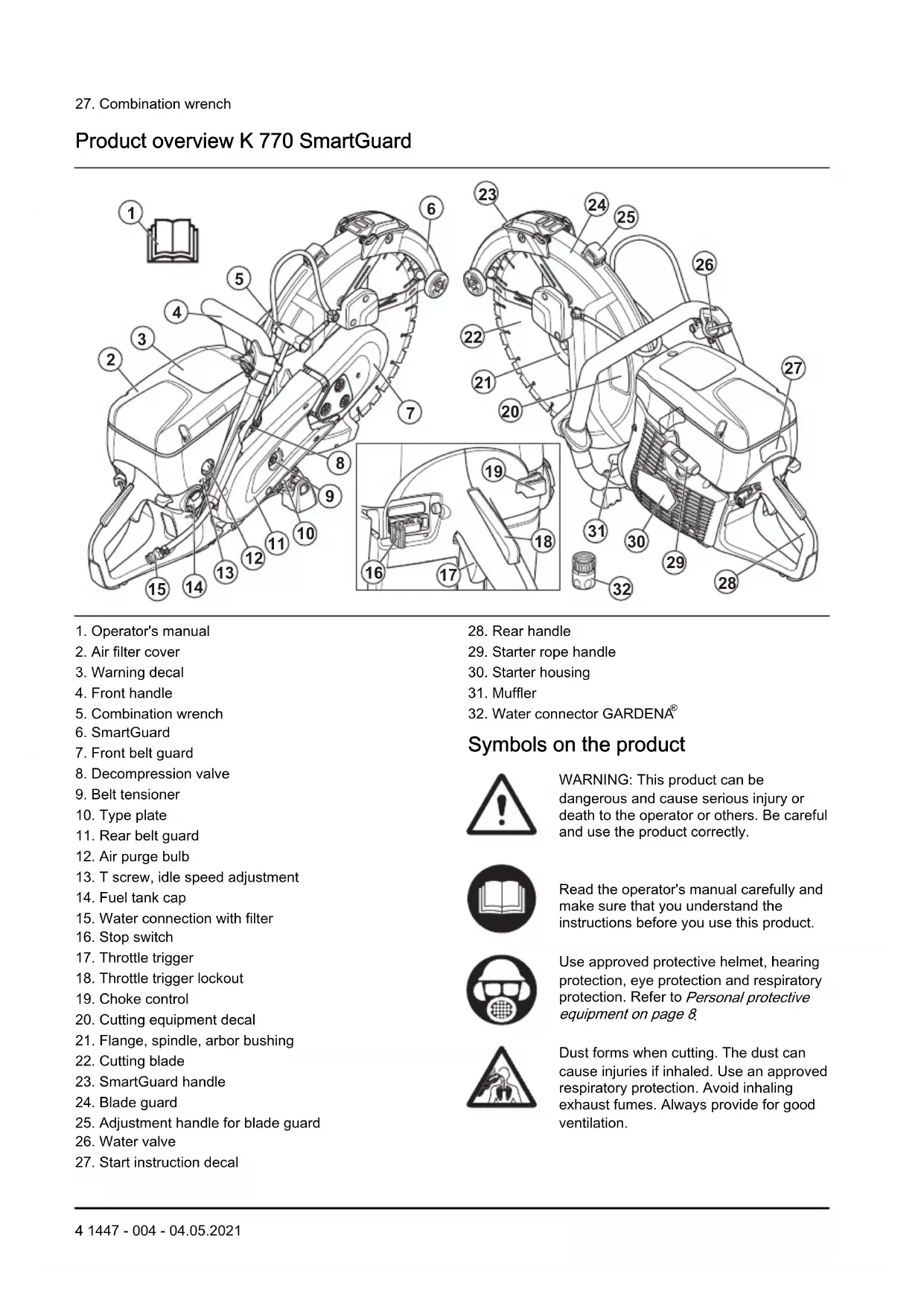 Dust forms when cutting. The dust can cause injuries if inhaled. Use an approved respiratory protection. Avoid inhaling exhaust fumes. Always provide for good ventilation. 4 1447 - 004 - 04.05.2021WARNING! Kickbacks can be sudden,rapid and violent and can cause lifethreatening injuries. Read and understandthe instructions in the manual before usingthe product. Refer to Kickback on page